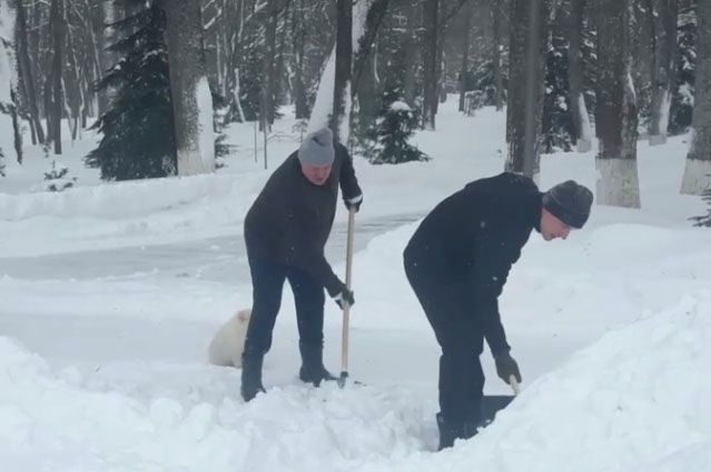 На кадрах видно, как Александр Лукашенко убирает снег вместе с простыми рабочими на территории вокруг здания в окружении заснеженных елей.