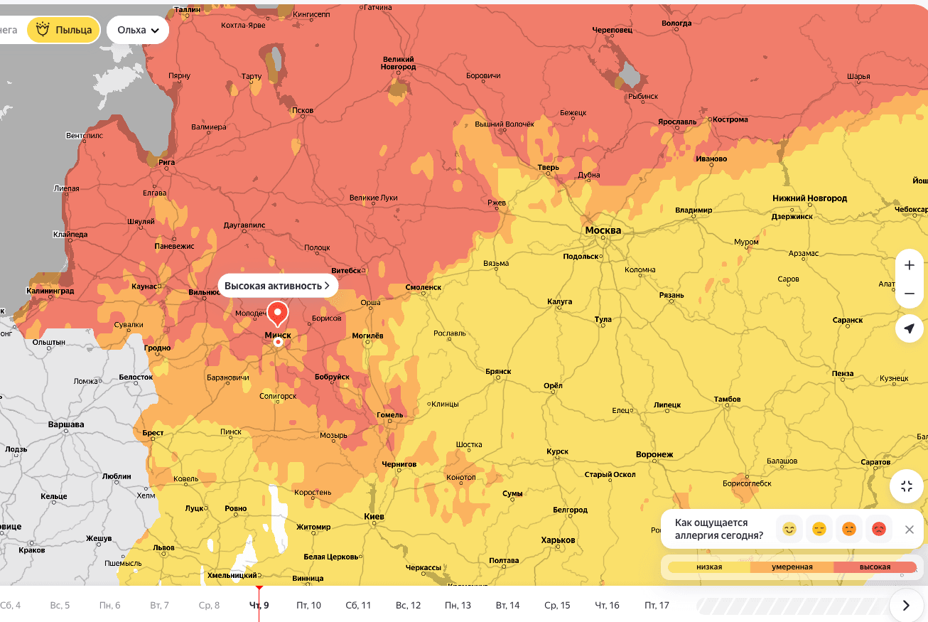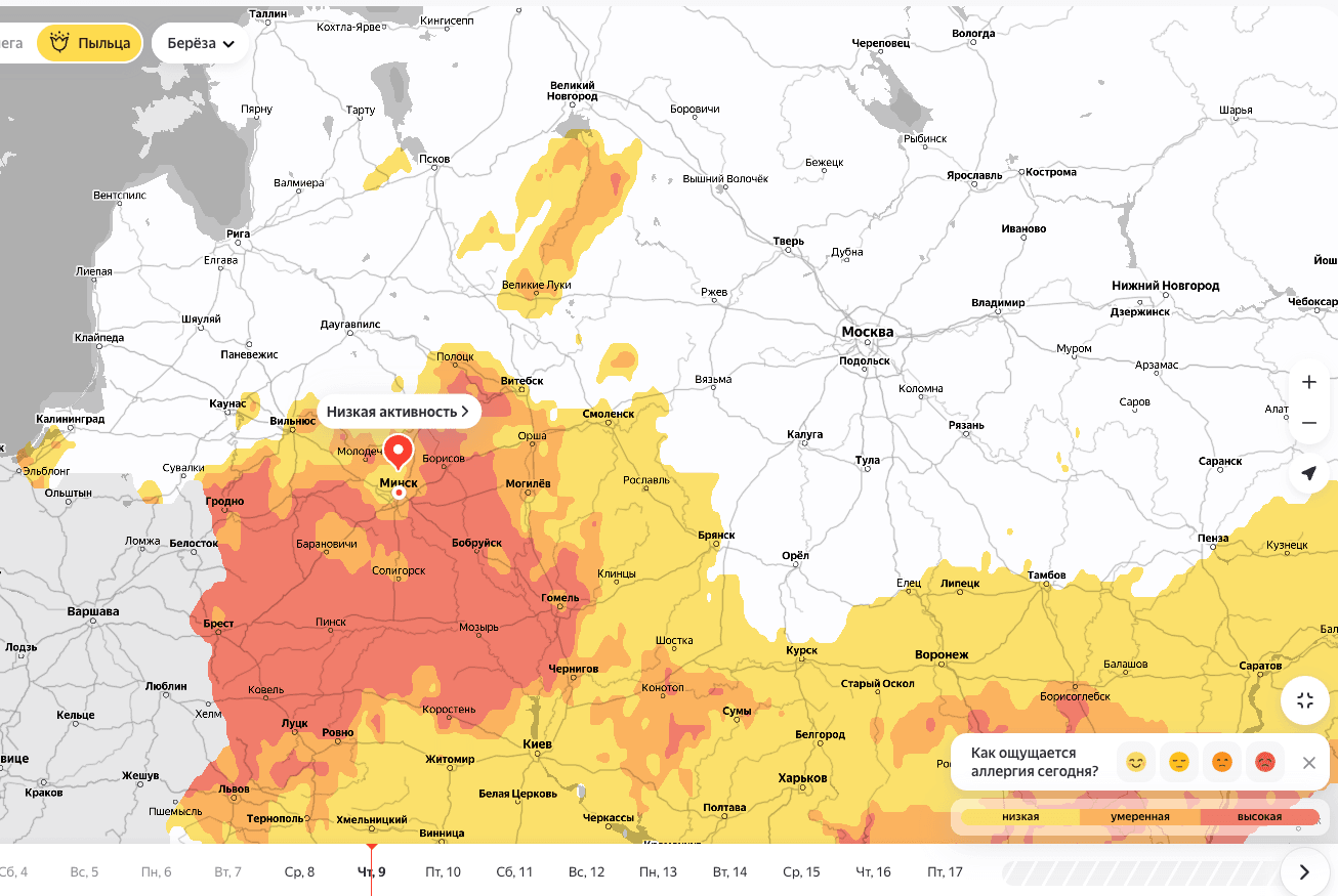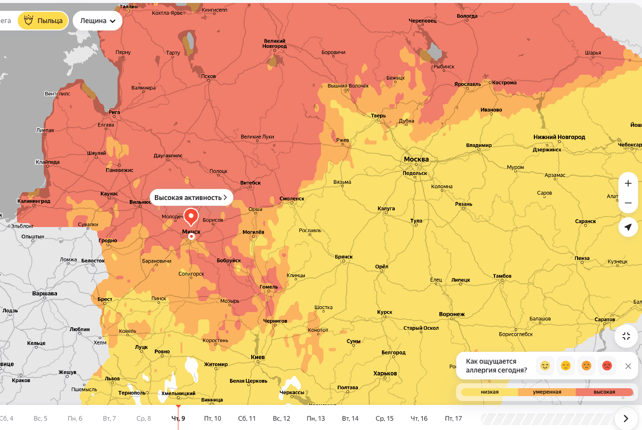 С березой обстановка отличается кардинально. В Гродненской, Брестской и Гомельской областях будет высокий уровень активности, поэтому аллергикам из этих регионов не позавидуешь. Легче станет только ближе к 11 апреля.