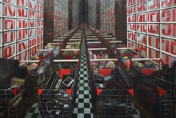 Вторая работа – гипермаркет без людей. Одежда, коробки, обувь, лабубу – все смешано в безумном потоке вещей. И на экранах по периметру одно слово на десяти языках – призыв маркетологов тратить деньги: «покупайте», «sale» и др.