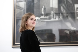 «Это моя дипломная работа. Она в двух экземплярах: одна здесь, это черновик, вторая в цвете в университете, – указывает девушка на большое черно-белое полотно. – Я в отражении. Совсем крохотная, а вокруг мастерская, которая символизирует огромный мир».