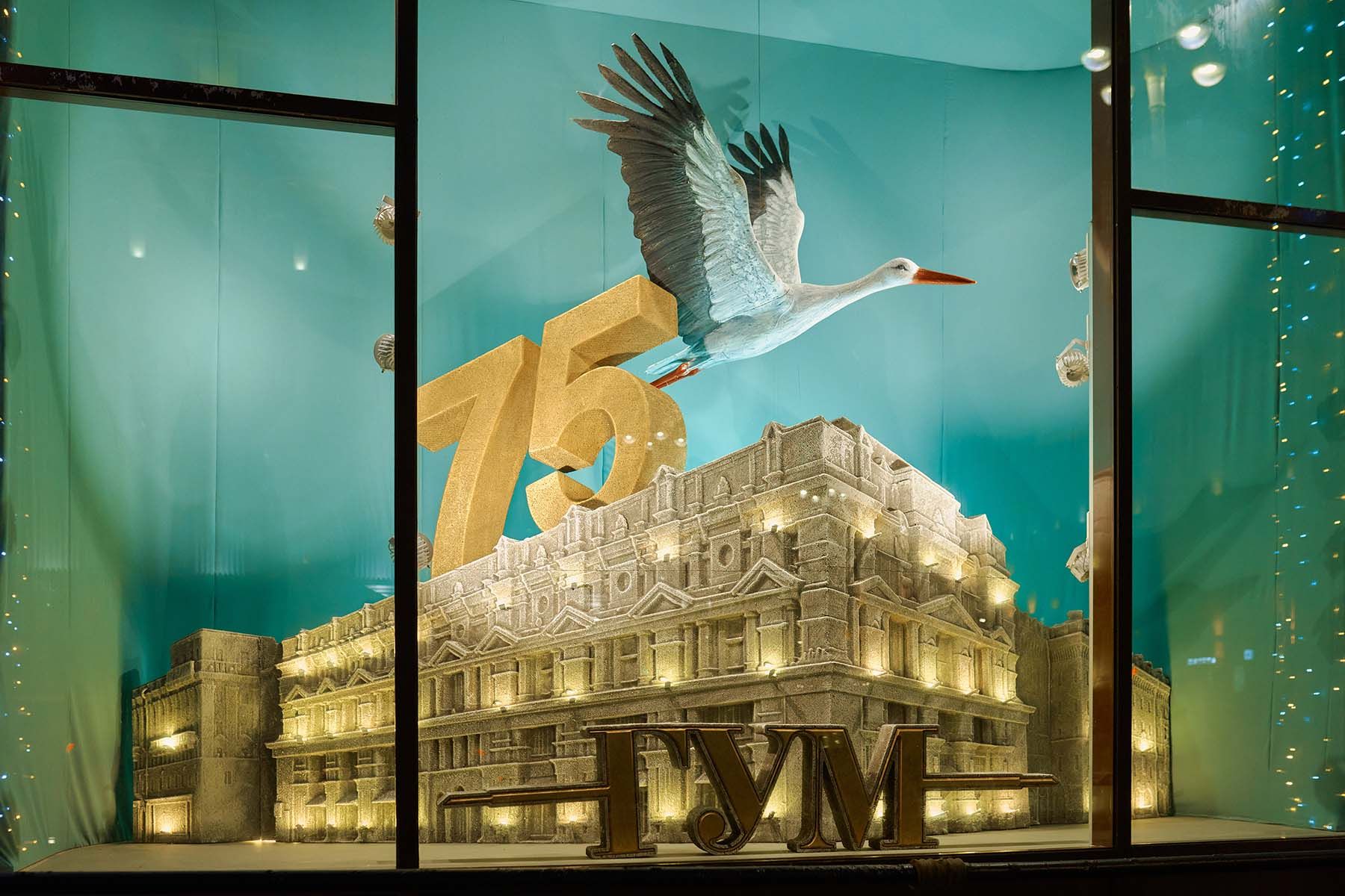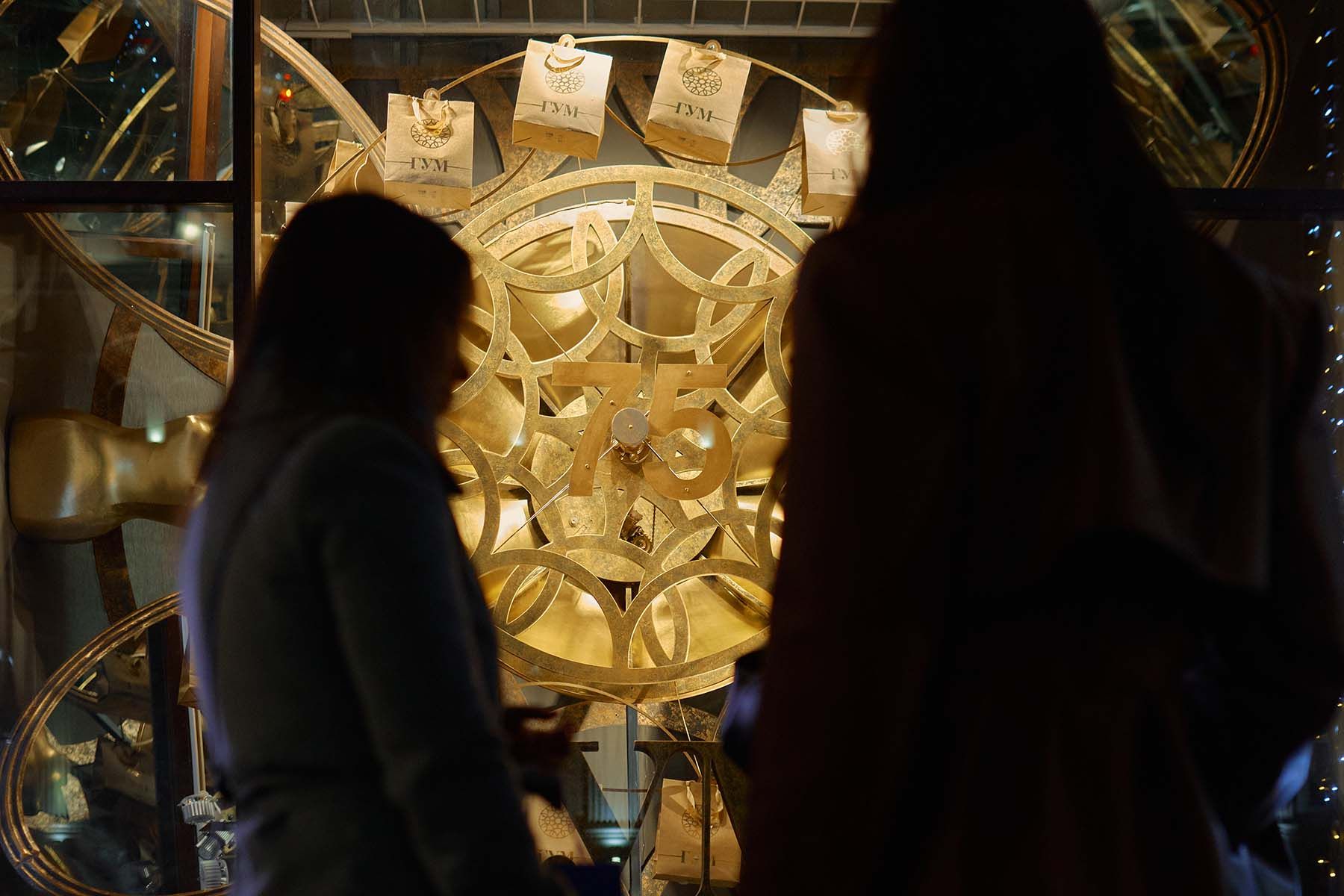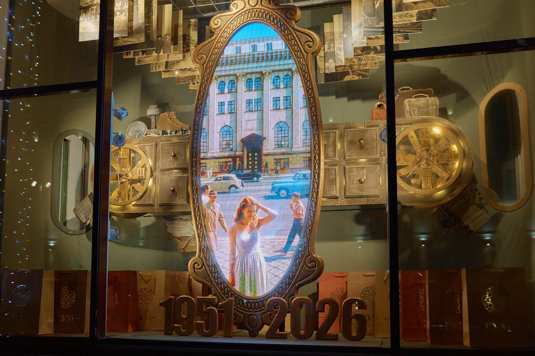 Композиции ГУМа показывают его богатую историю. В оформлении используются теплые золотые оттенки, декоративные часы и предметы, напоминающие о классической атмосфере главного магазина столицы. А с помощью технологий искусственного интеллекта удалось воссоздать атмосферу 1950-х, когда универмаг был основан.