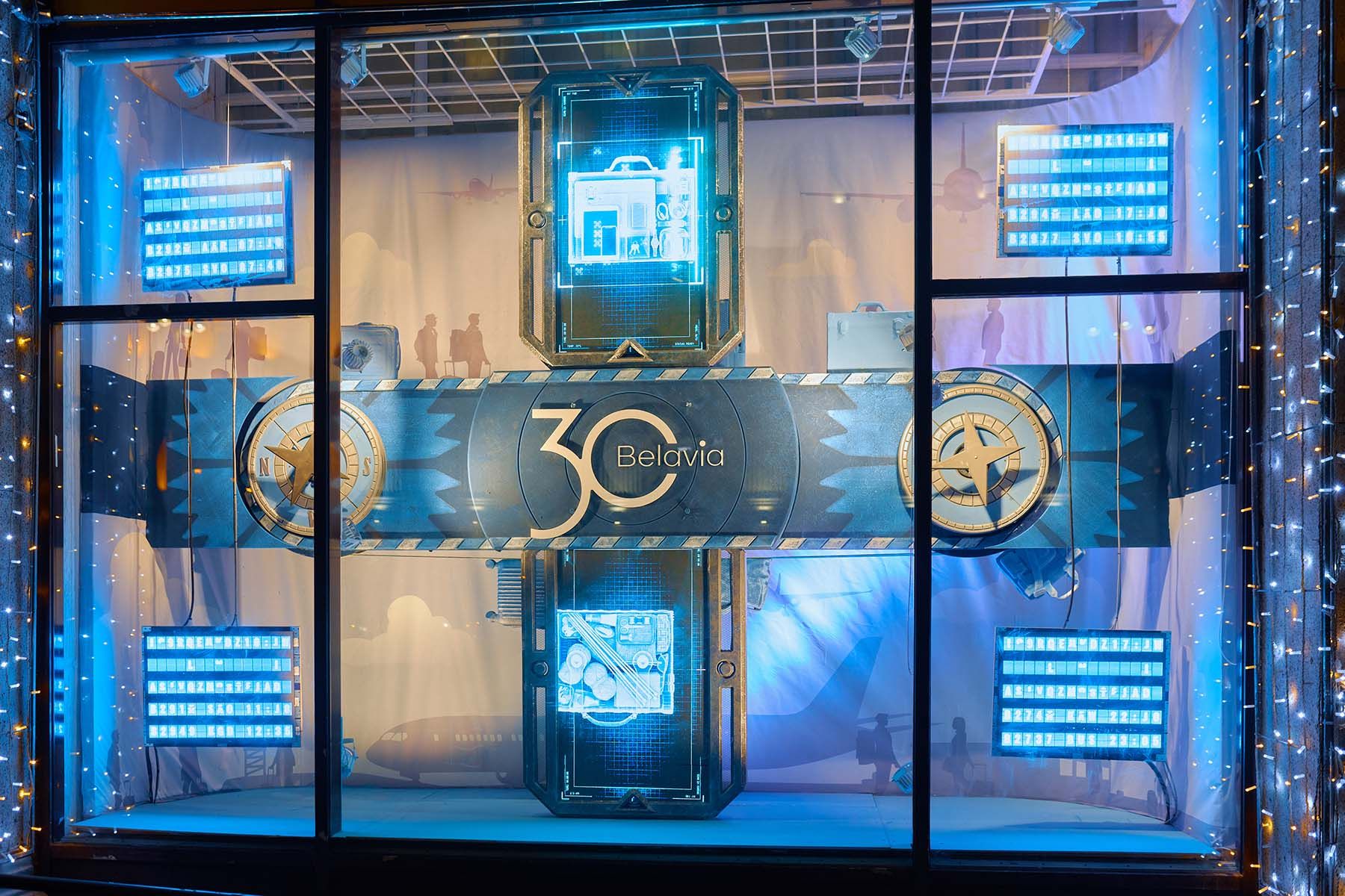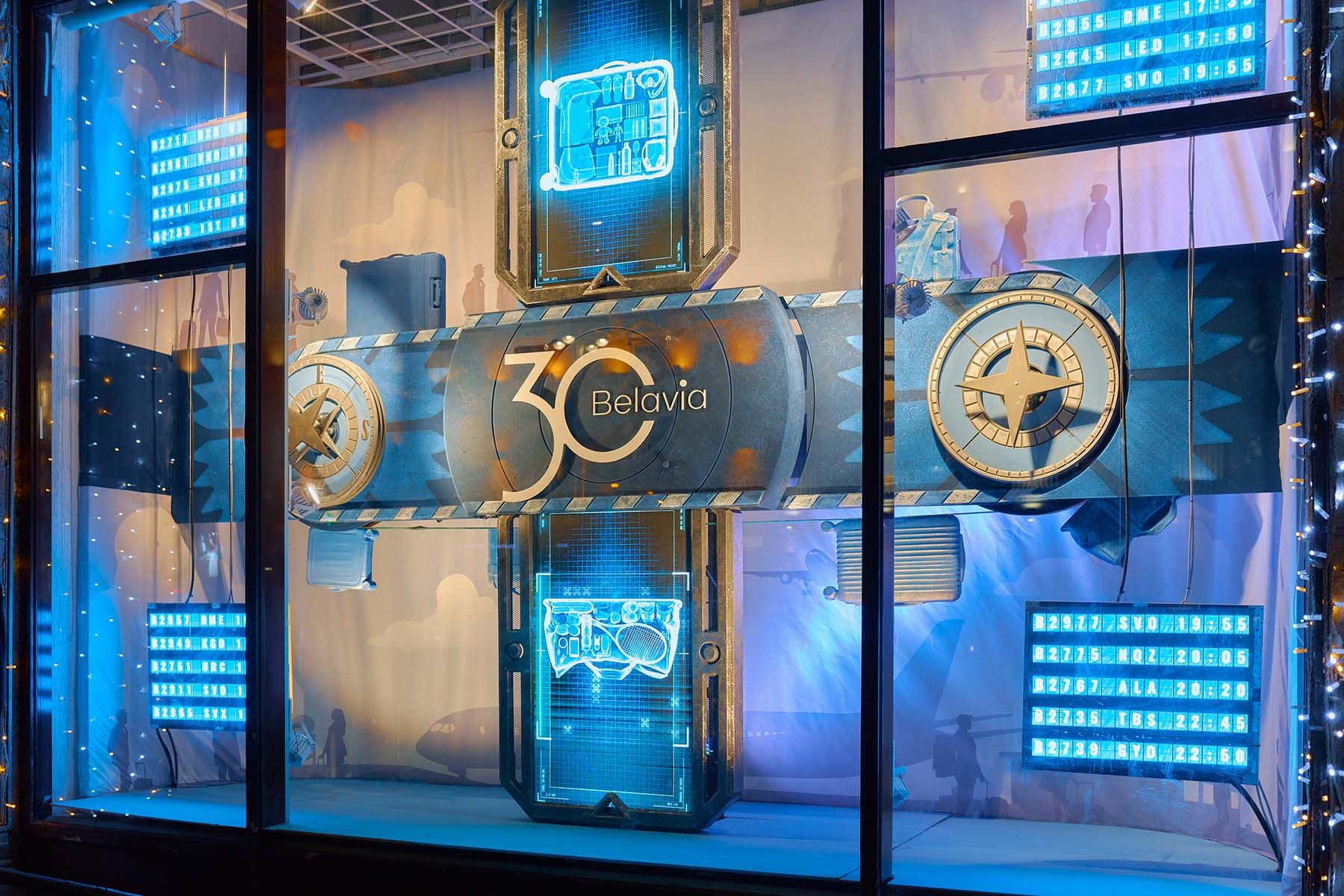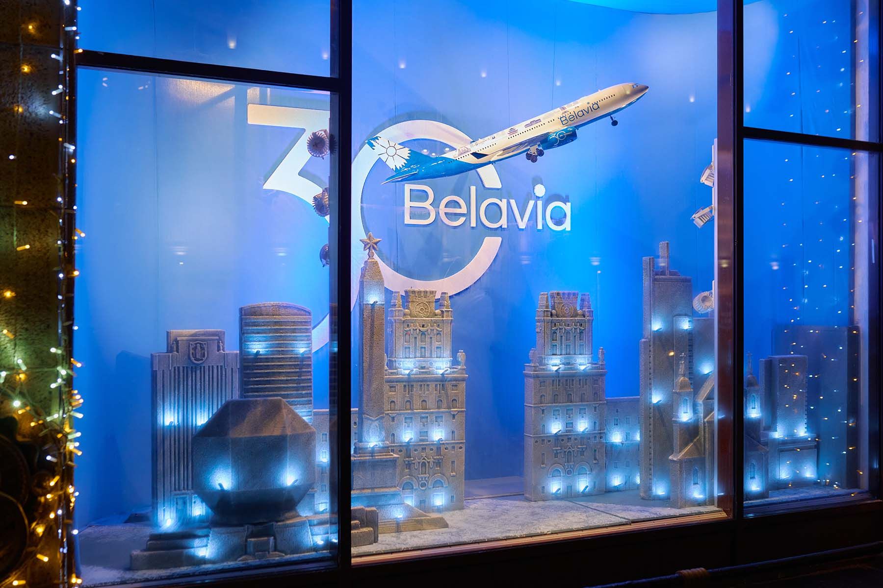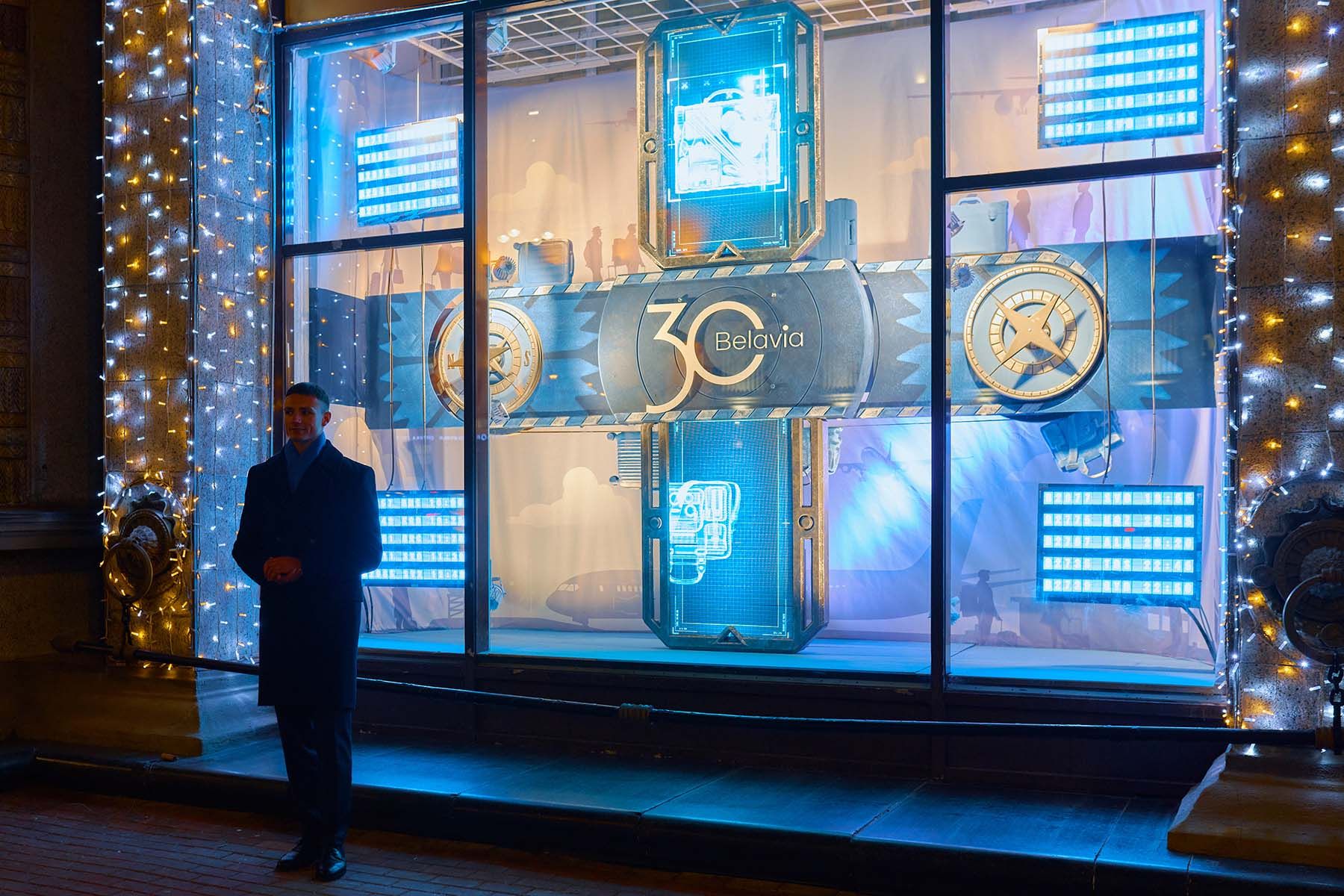 В оформлении витрин «Белавиа» использовались элементы, вдохновленные авиацией и атмосферой аэропорта: силуэты самолетов, табло прилета/вылета, облака и панорама города, багажная лента, сканер досмотра и так далее.