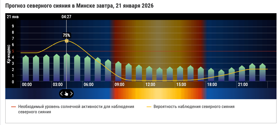Процент появления в небе яркого северного сияния составляет более 50, а вот пик будет в половину пятого утра. В это время небо может озариться с вероятностью в 75%.