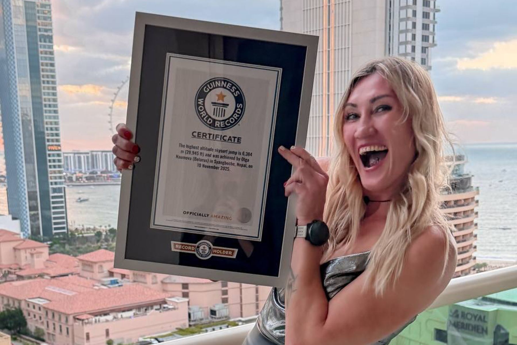 «Достигнув высоты 20 945 футов (6384 м), решительная спортсменка выпрыгнула из двери вертолета и, падая с доской на головокружительной скорости, направилась к скалистым горам вниз», – красочно описывает достижение белоруски Книга рекордов Гиннесса.