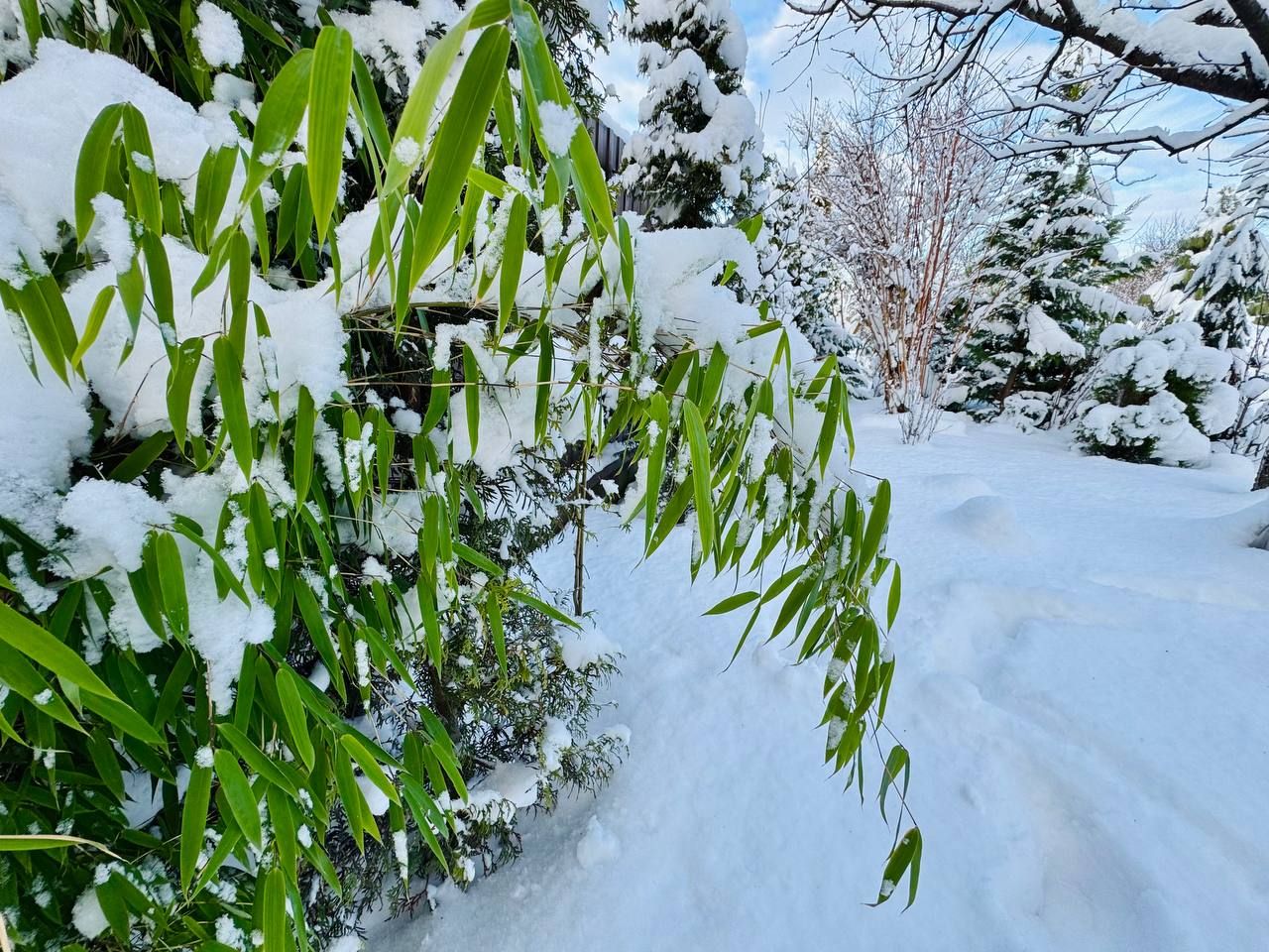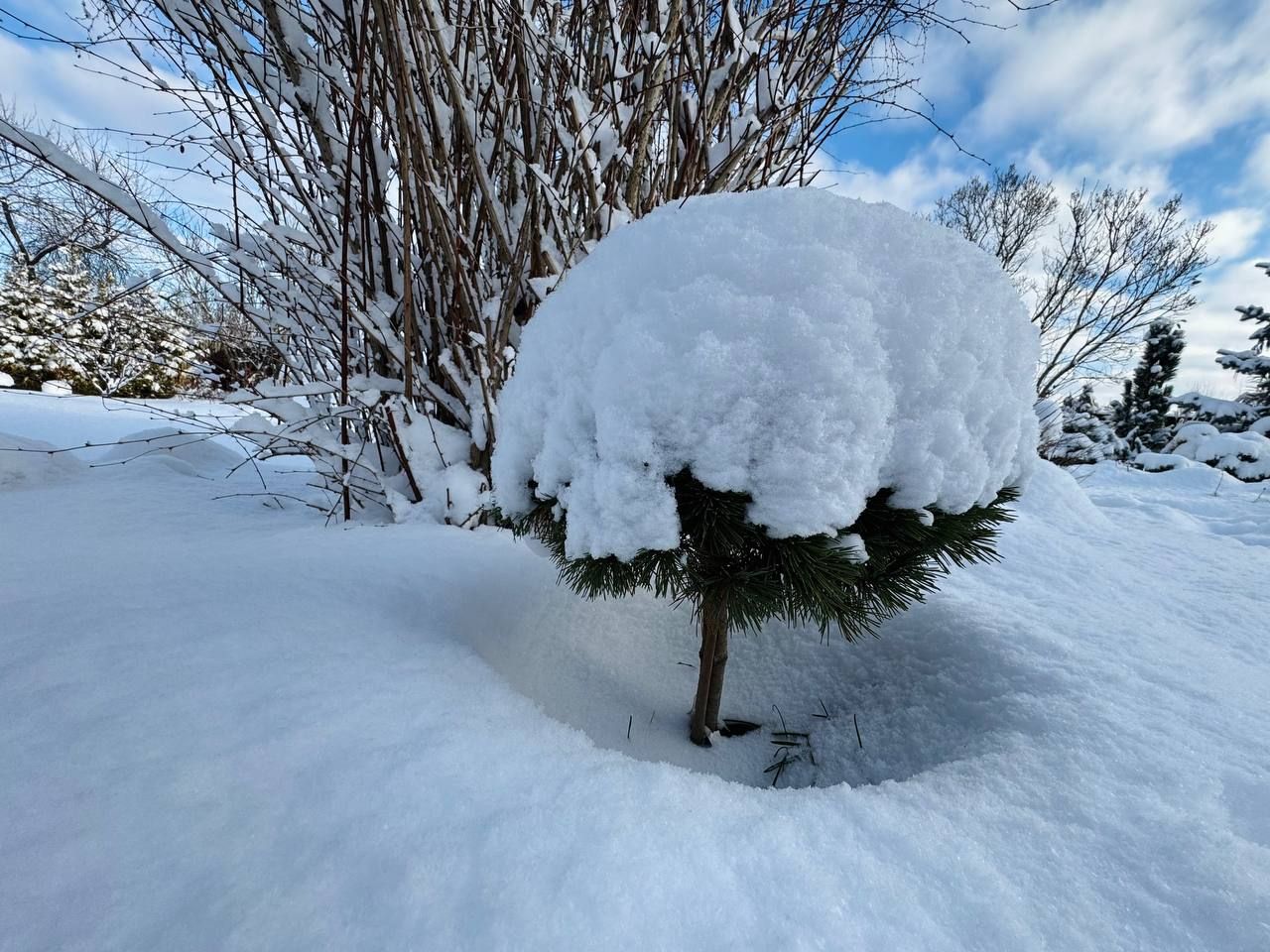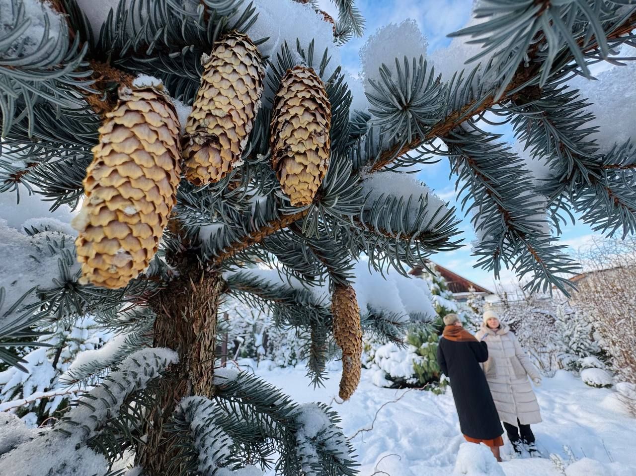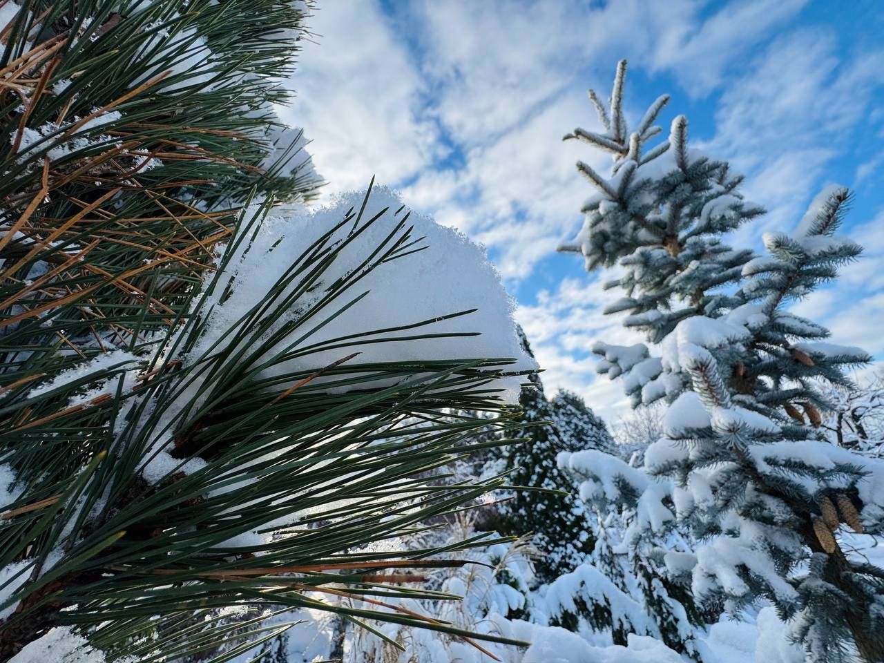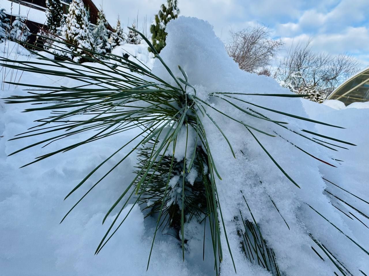 Мы следуем за ней по тропинке в ожидании чего-то милого и плюшевого. И почти угадали: под снежными шапками спрятались хвойные крепыши. Туя Випкорд похожа на зеленый фонтан, а сосна Сюссе Перле – на пушистый зеленый шар.