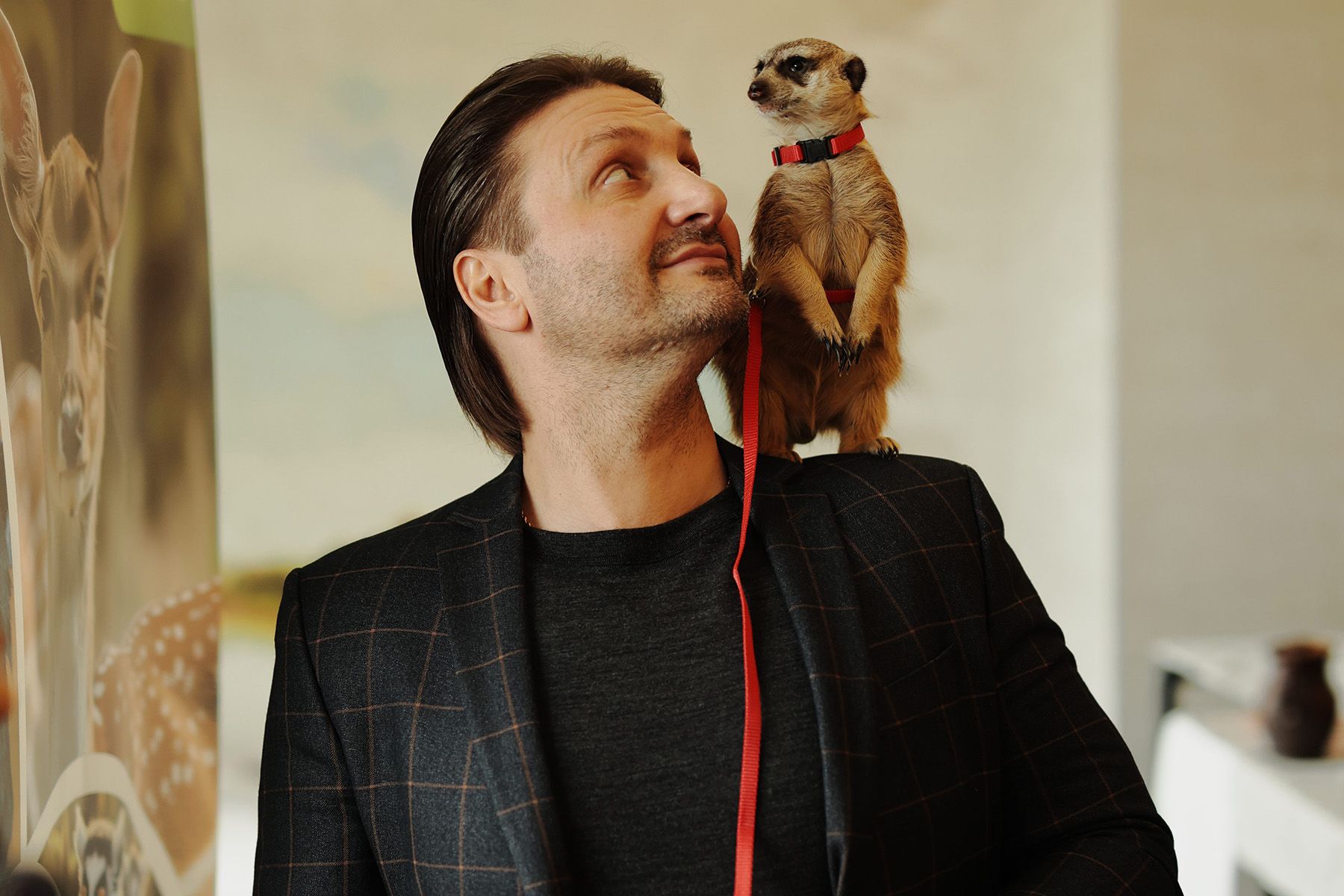 Причем мелкий хищник, похоже, со старта оценил, на чьем плече сидит, и периодически вытягивался по струнке. Но быстро забывал про пиетет и использовал высокого гостя как трамплин к столику с кормом.