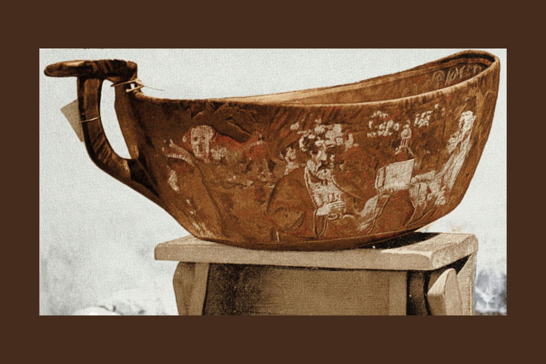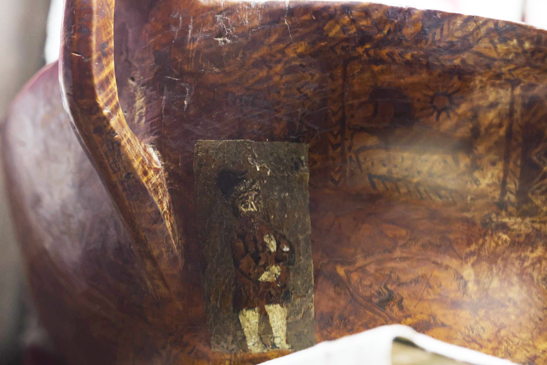 По его словам, этот ковш от любых аналогов отличается и по форме, и по художественному исполнению. Примеров соответствующей росписи по стилю и сюжетам до сих пор не найдено.