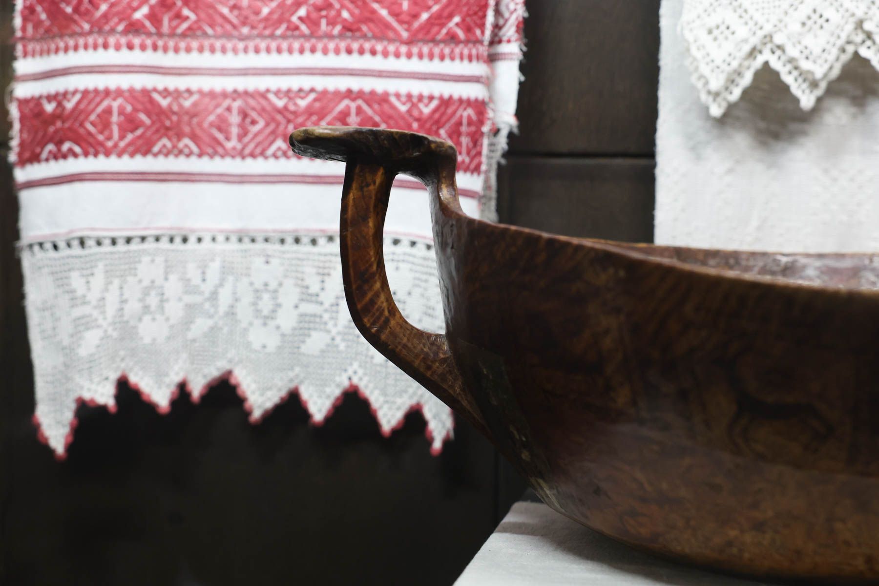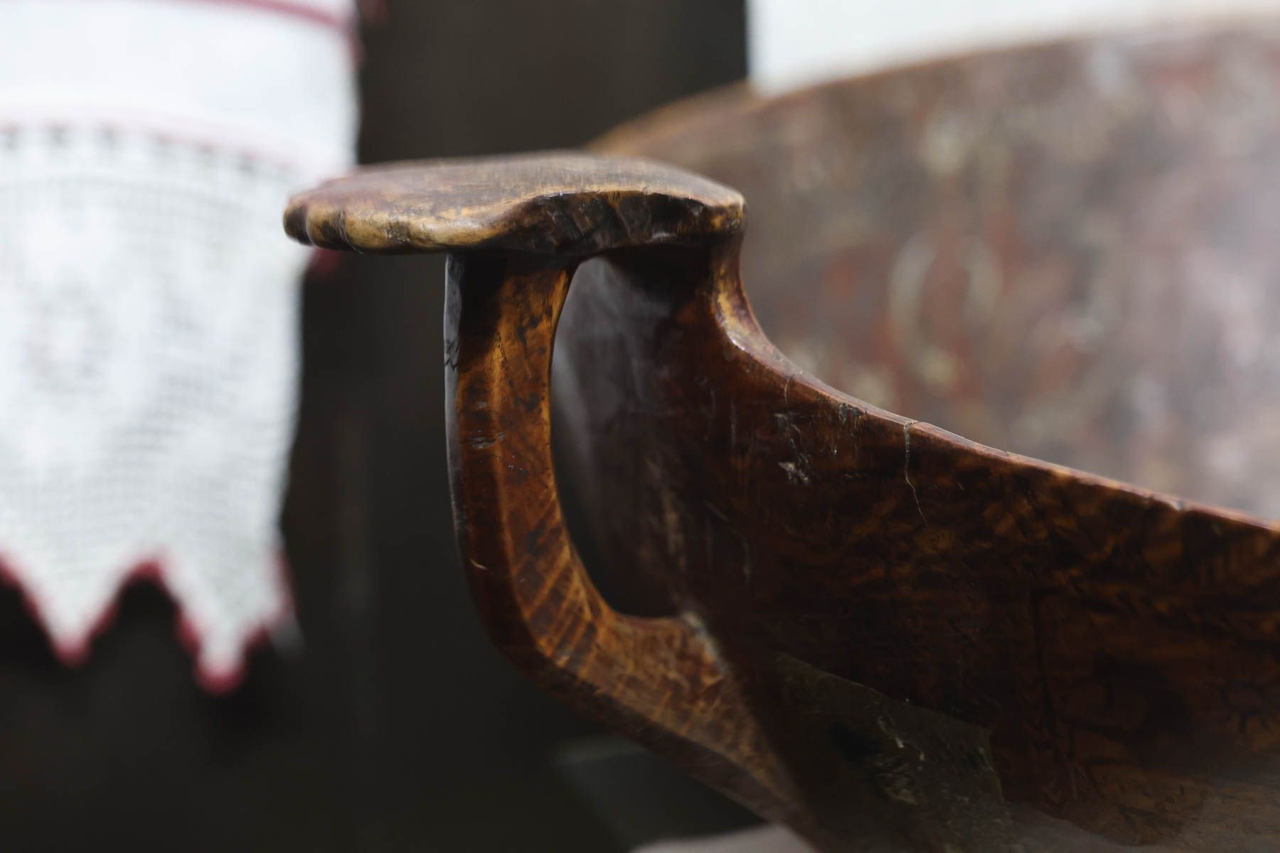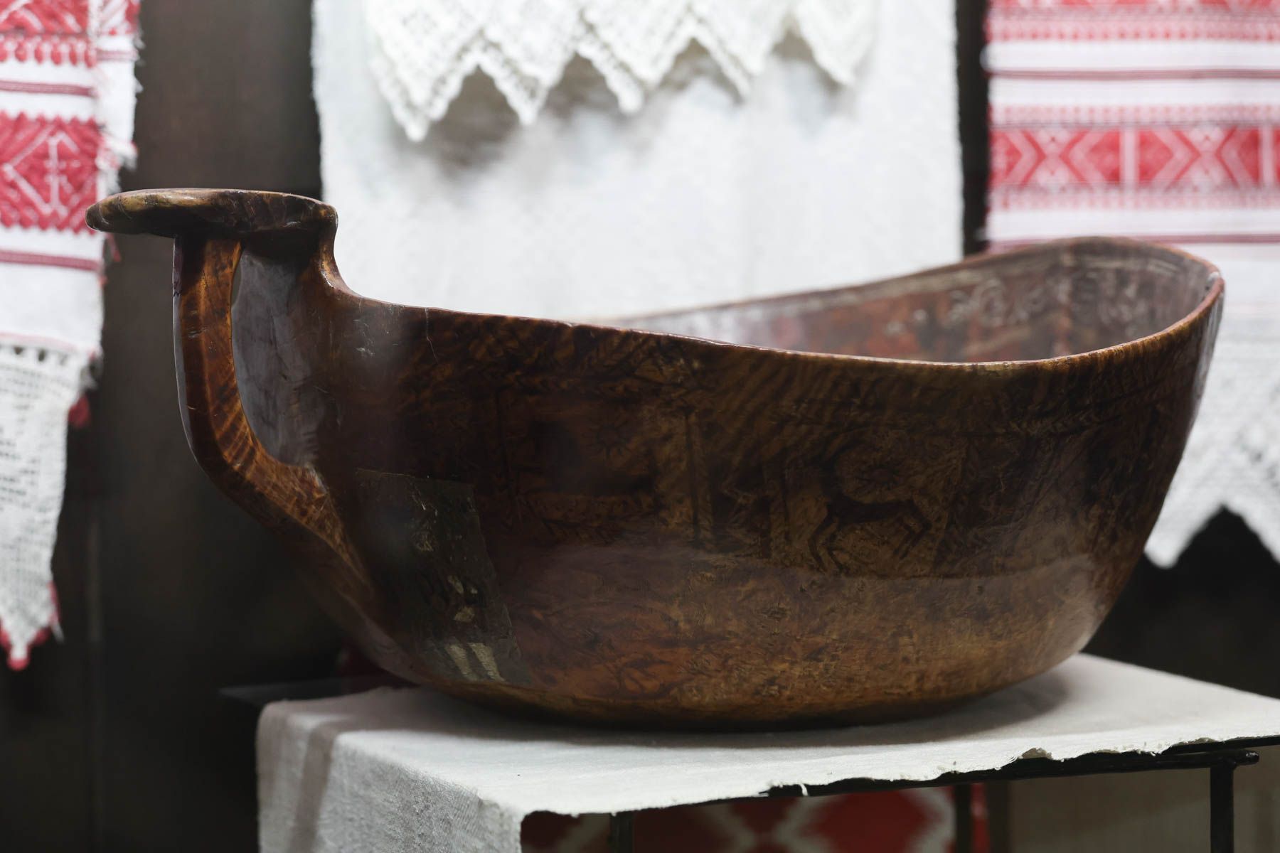 Ковш изготовлен из березового капа, то есть из нароста на березе, который был популярным материалом для изготовления разного рода предметов благодаря своей прочности.