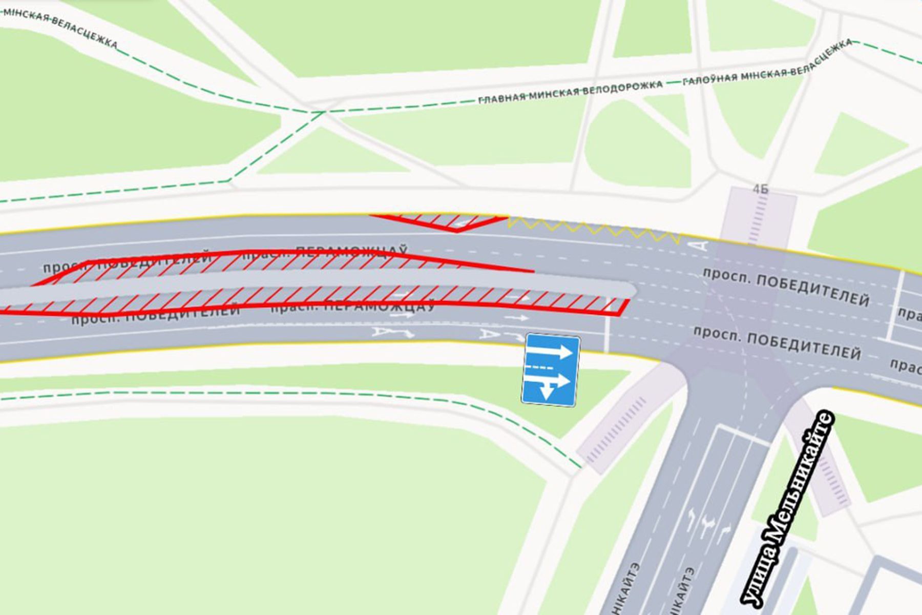 Автомобильное движение изменится на проспекте Победителей в районе пересечения с улицей Мельникайте. В каждом направлении количество полос уменьшится с трех до двух. Это связано со строительством третьей ветки метро.