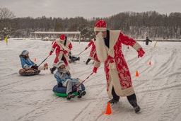 После торжественного шествия новогодние герои вместе с гостями праздника соревновались в забегах, «Покатушках на ватрушке» и веселых гонках «Сказочная лыжня».