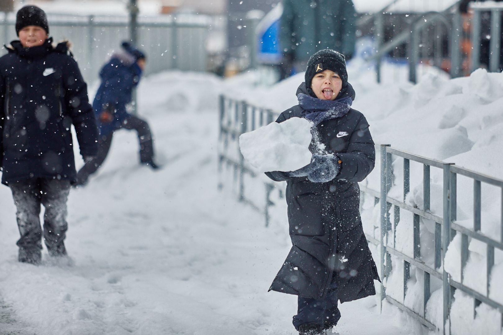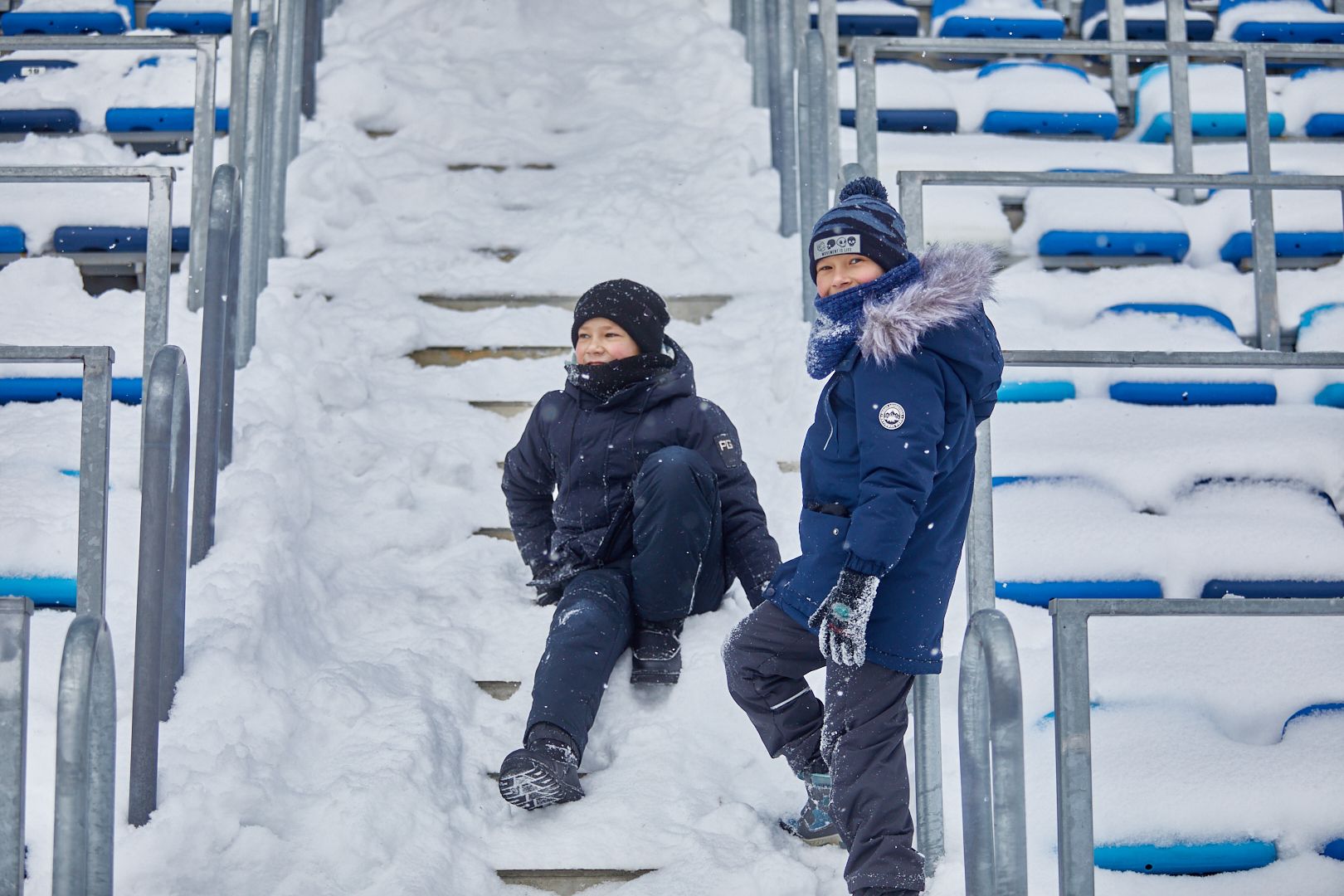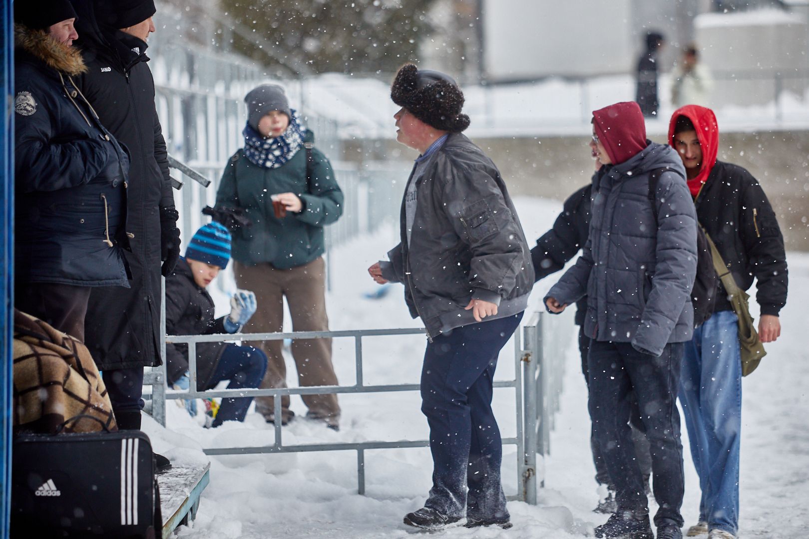 Дети во время игры резвились со снегом. Трибуны практически не чистили от снега. Местами их можно было использовать как мини-горку.