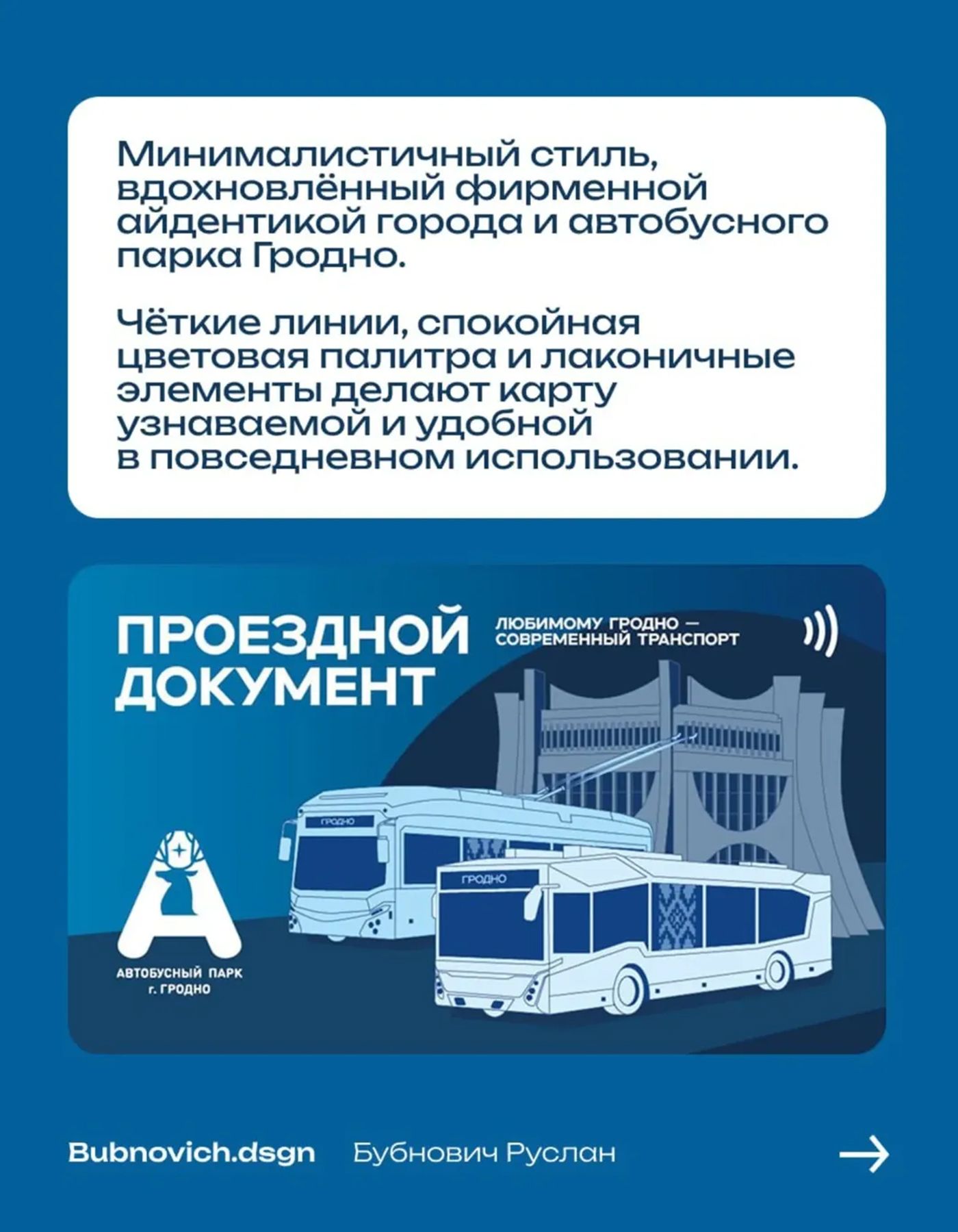 Гродненский автобусный парк организовал конкурс на разработку дизайна лицевой стороны пластиковой карты для оплаты проезда. Всего был представлен 41 вариант. Жители города голосовали за понравившийся и выбрали дизайн, предложенный Русланом.