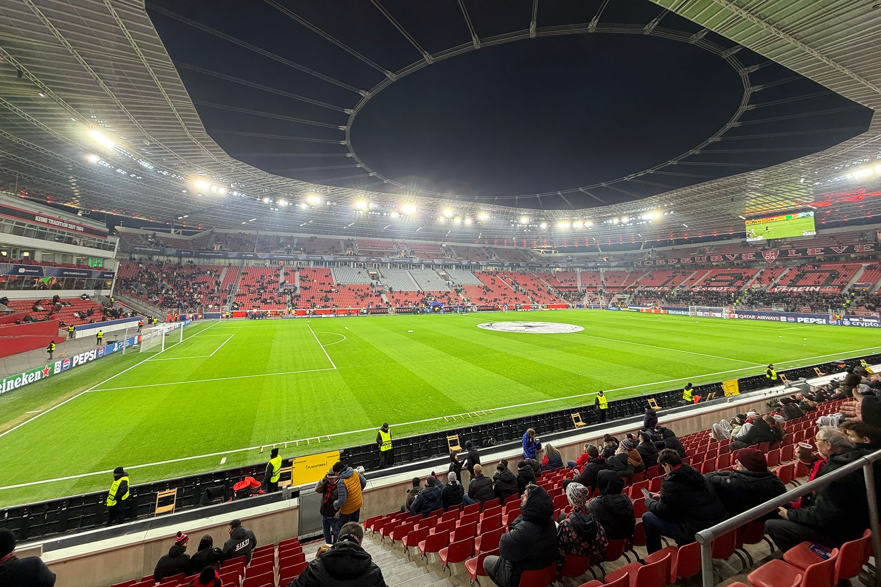 Заходим в чашу стадиона. Сразу охватывает непередаваемое чувство радости: мощный и приятный свет от прожекторов, зелень идеального газона, просторные трибуны, заводная музыка, море болельщиков.
