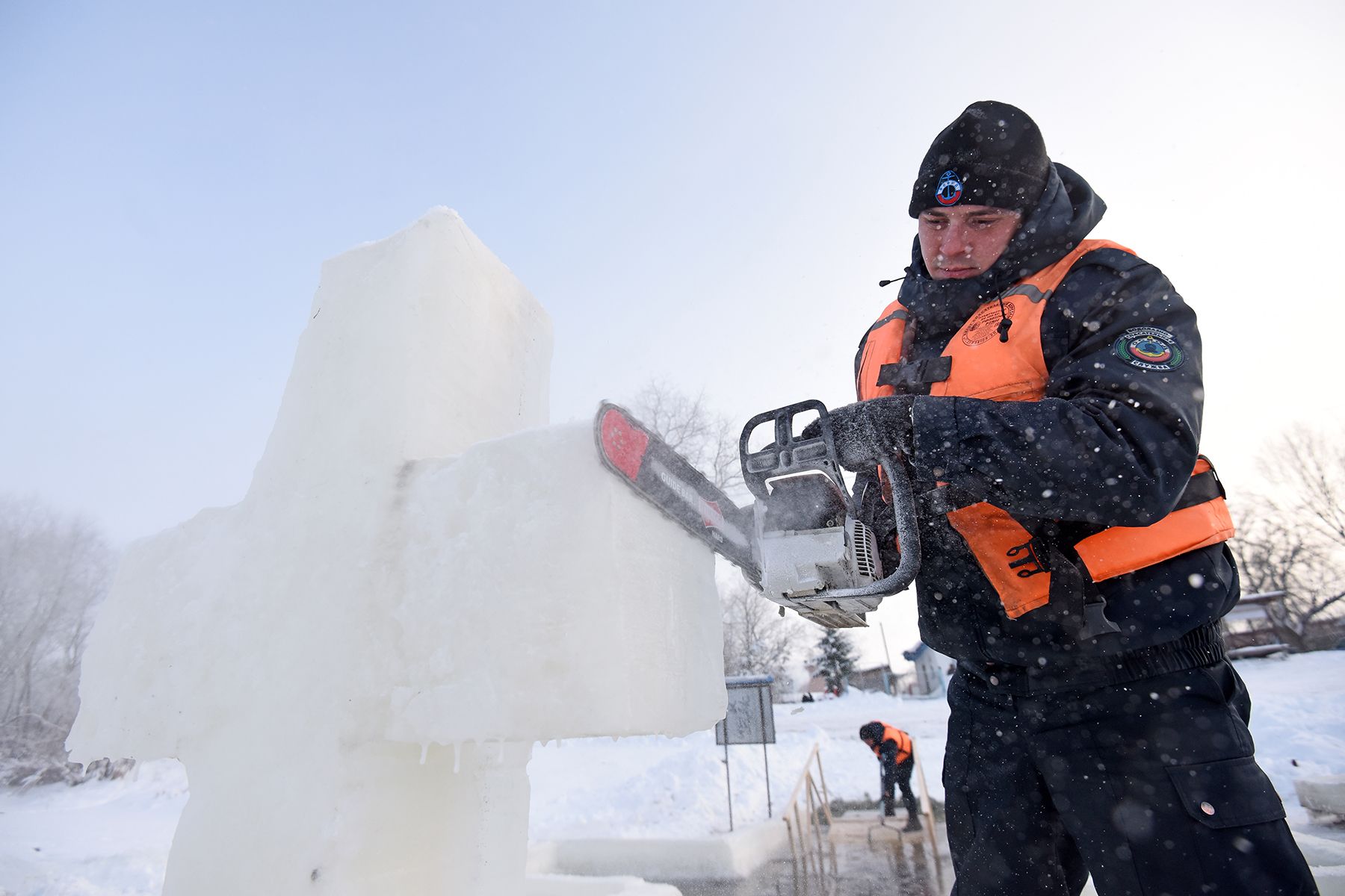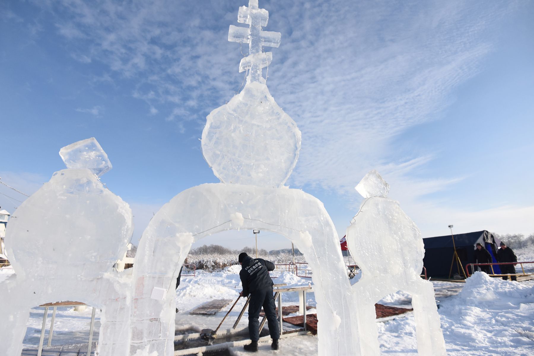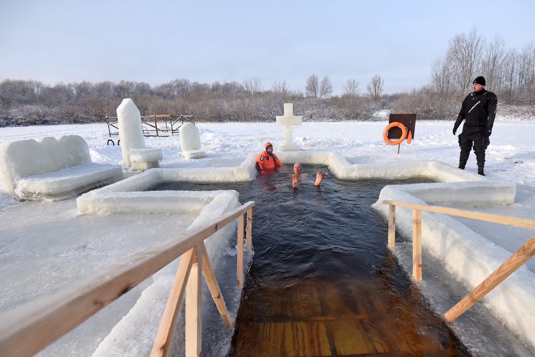В соседнем Добруше купель вырезали на притоке Ипути. Здесь спасатели превзошли себя: ледяная арка с куполами и крестом сверкает на солнце, как хрусталь. Подготовка заняла четыре дня.