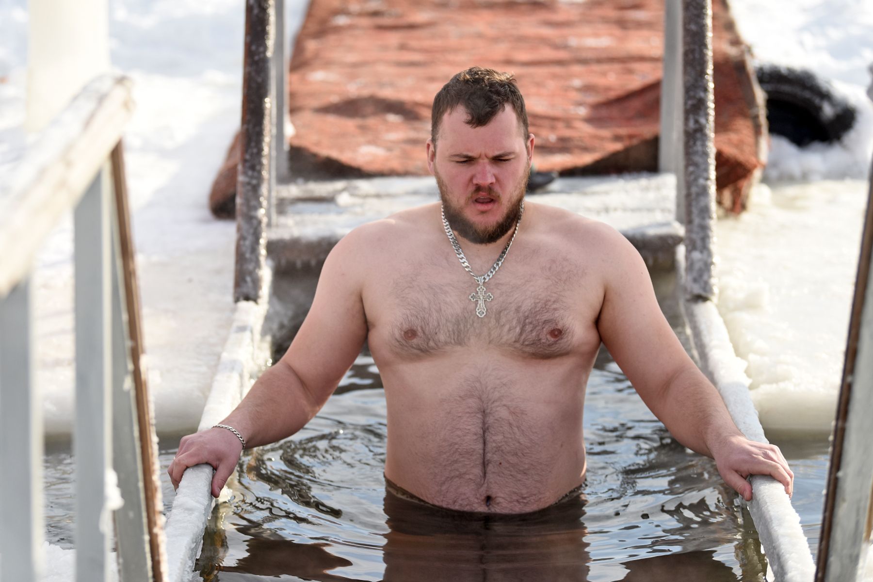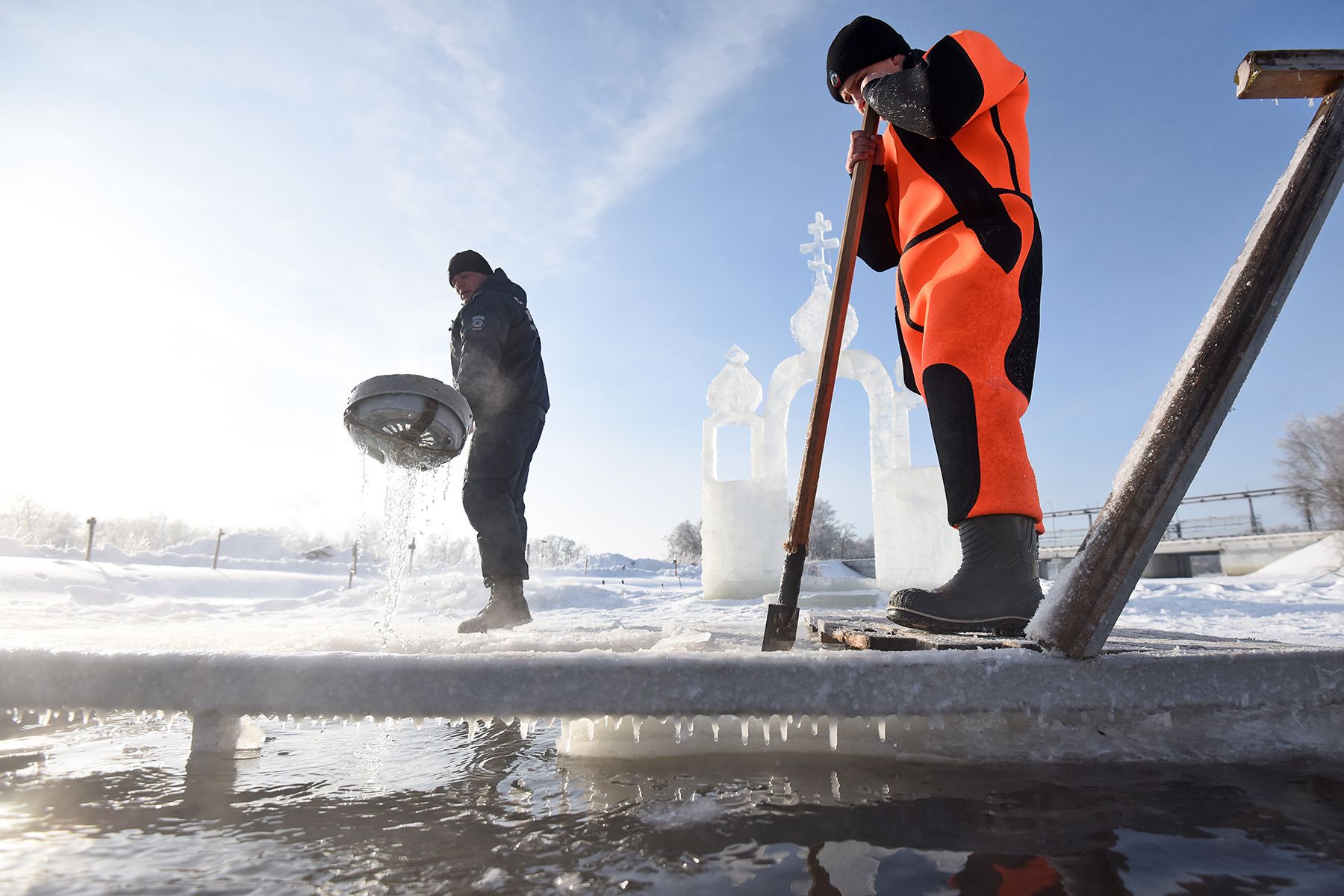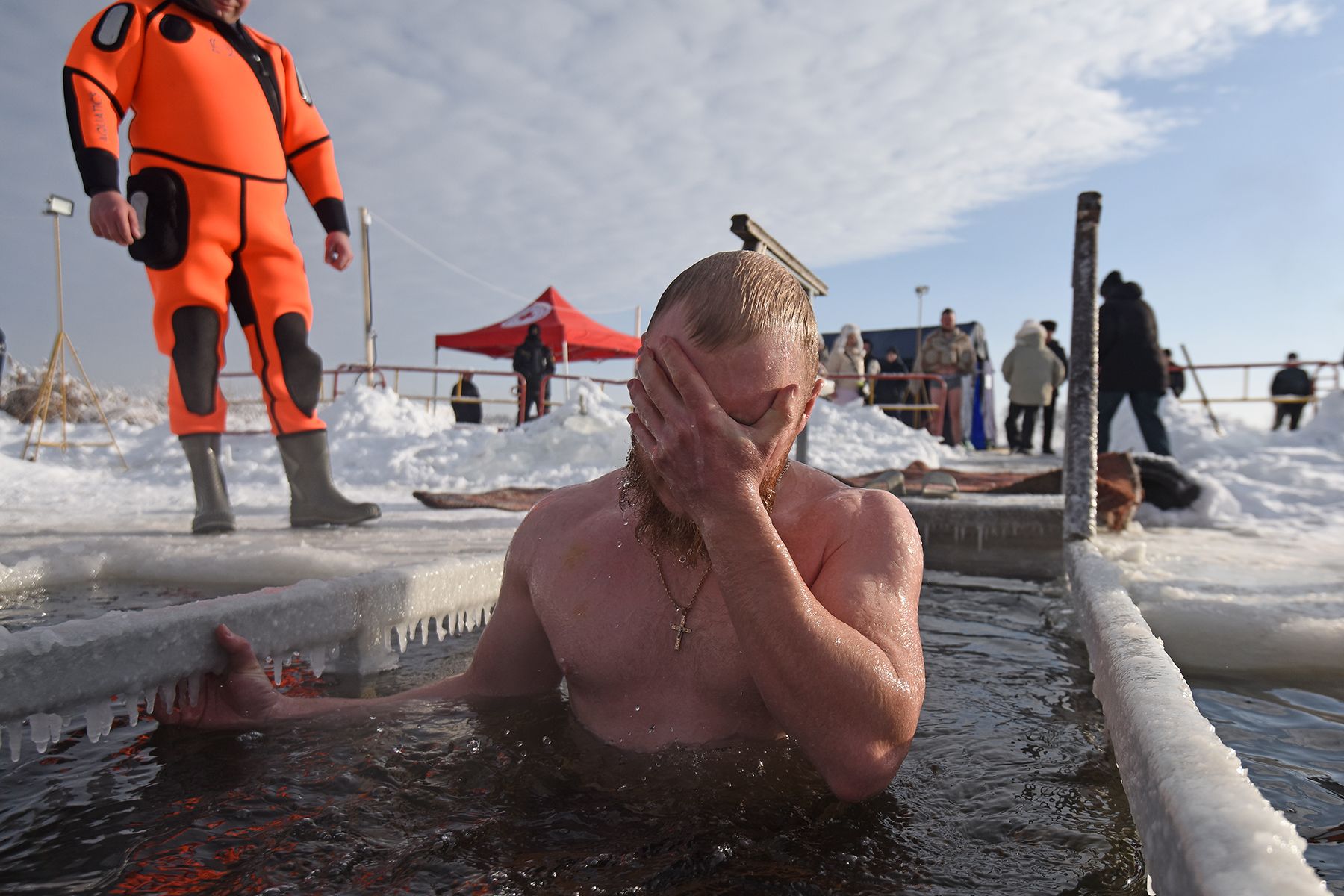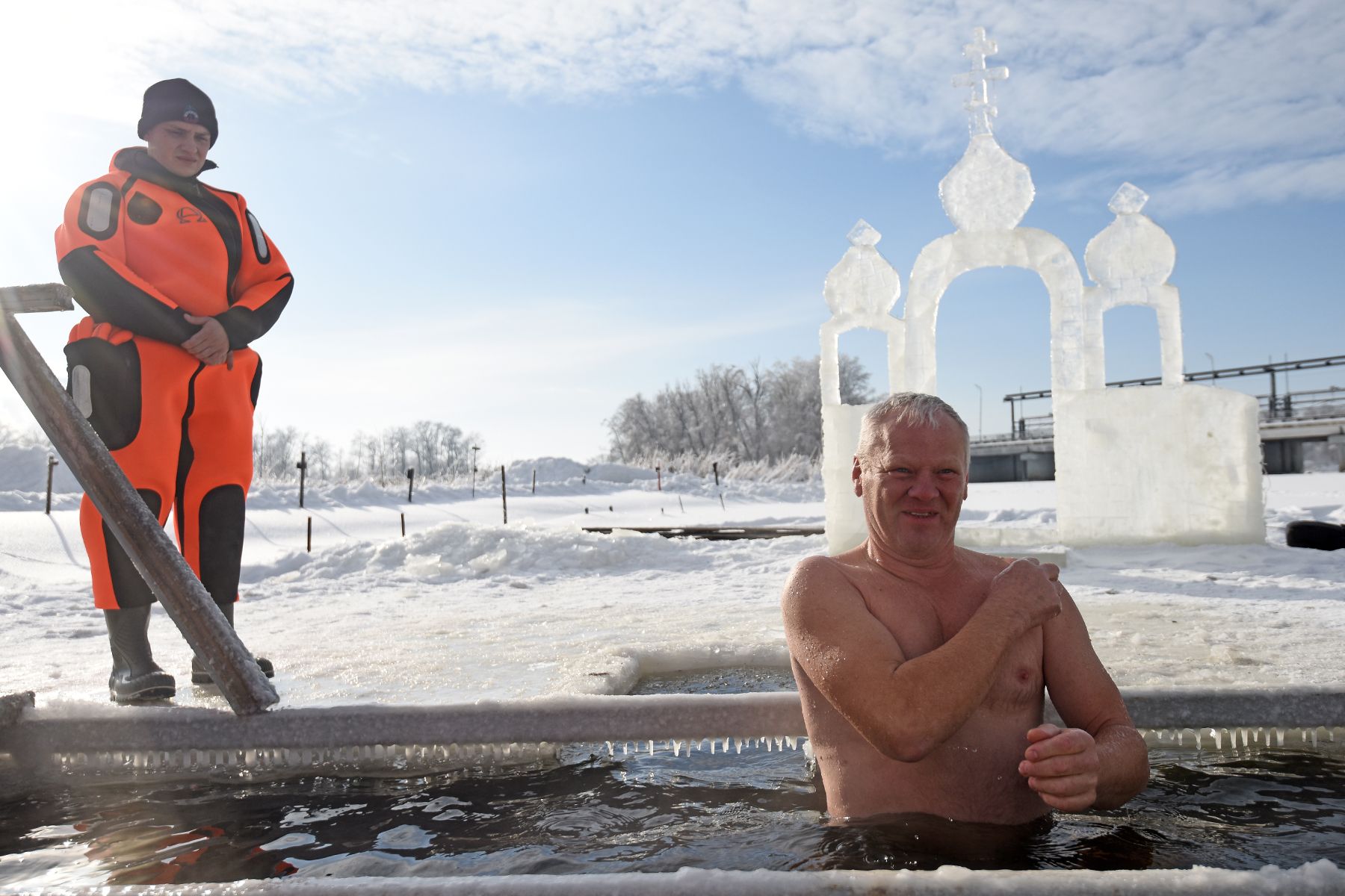 Сама купель тоже необычной формы и размера. Гигантский крест 8 на 4 метра способен вместить сразу несколько человек. Пока водолаз бензопилой поправляет контур ледяного дивана, появляется первый ныряльщик – 62-летний Алексей Коробушкин.