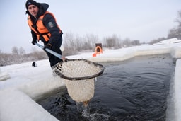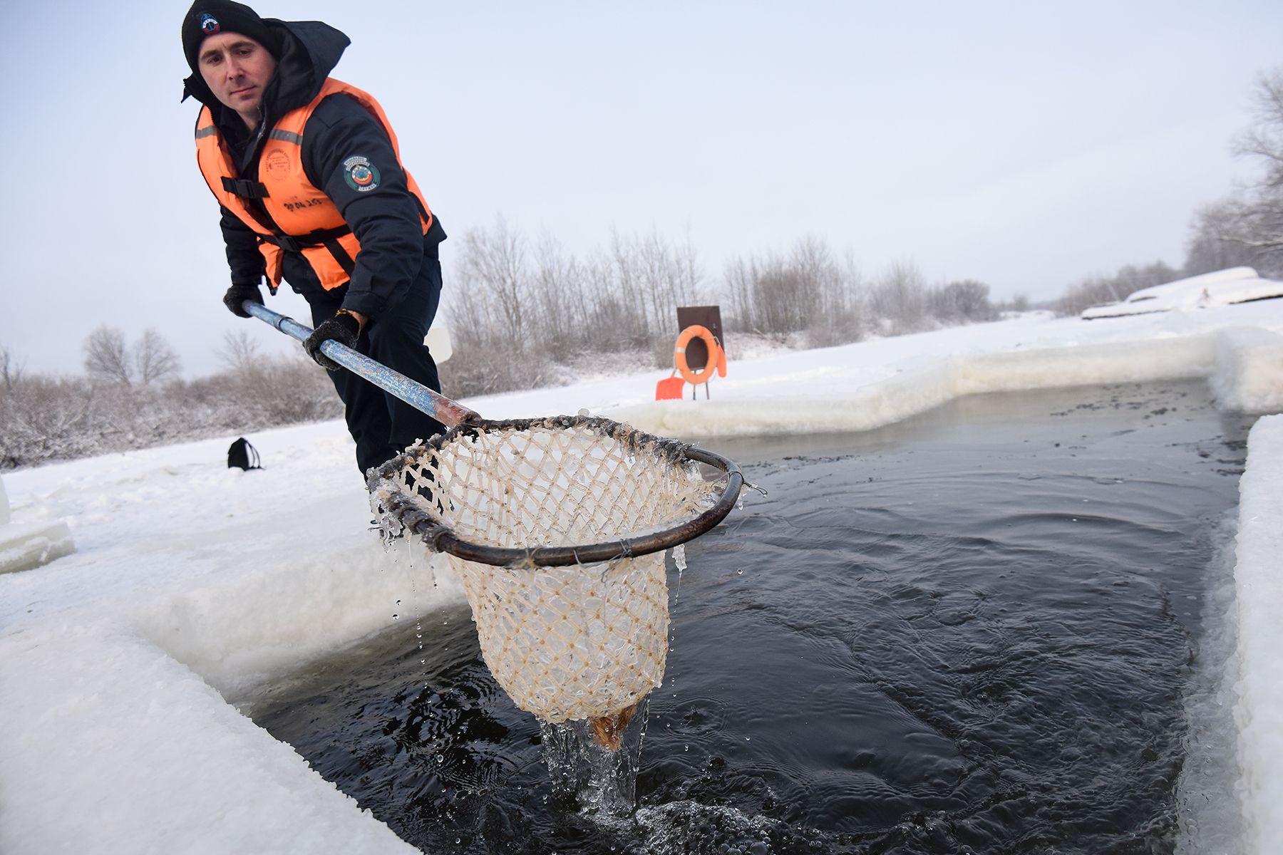 «Видите, лед затягивает воду на глазах, поэтому каждые полчаса вычерпываем его, поддерживая прорубь открытой», – объясняет опытный водолаз Юрий Златин, исполняющий обязанности начальника Добрушской станции ОСВОД.