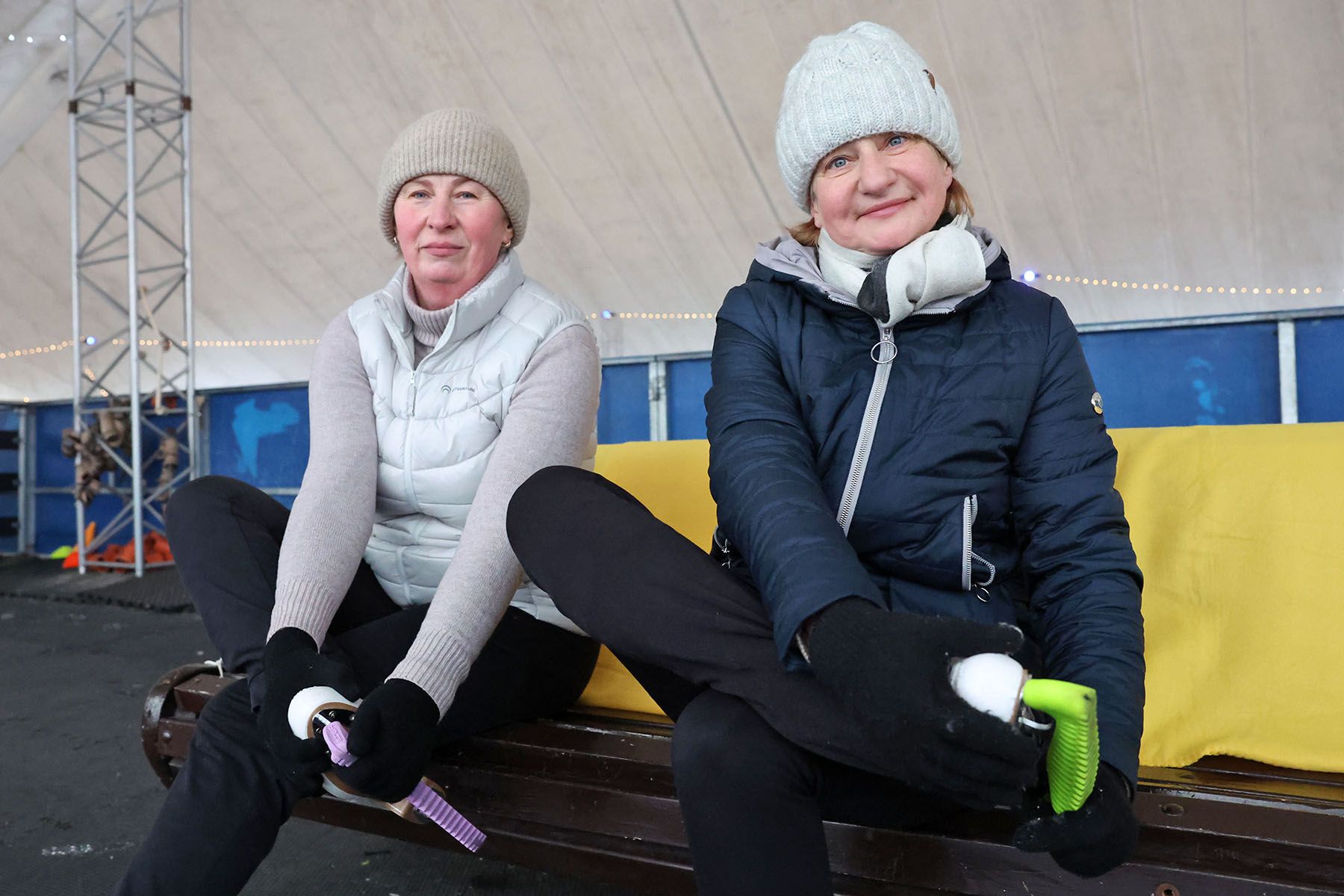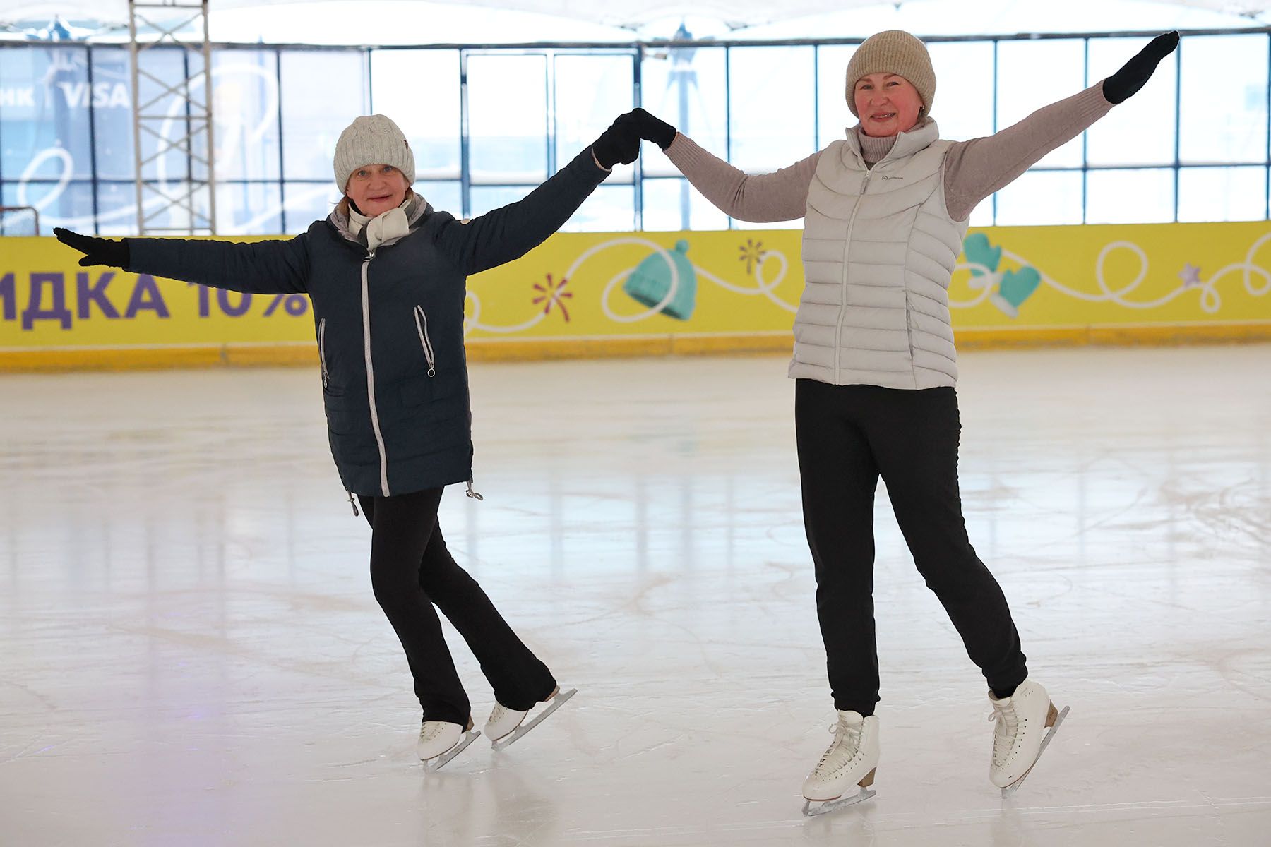 На часах – 10:06. В первые минуты сеанса на лед вышли около десяти человек. Одни уже сделали несколько больших кругов, другие еще держатся у бортика. В центре кружатся две фигуристки-пенсионерки Надежда и Лариса. Подруги учатся фигурному катанию в группе для людей серебряного возраста, а новые элементы приходят отрабатывать именно на этот каток.