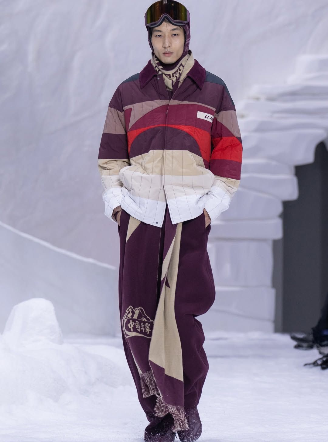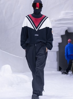 Кашемир, веками спасавший кочевников от морозов Центральной Азии, теперь согревает спортсменов на склонах Альп. Темно-синие костюмы из этого материала дополняют шелковая кайма, вышивка в виде рогов, высокий воротник против ветра и разрез для свободы движений.