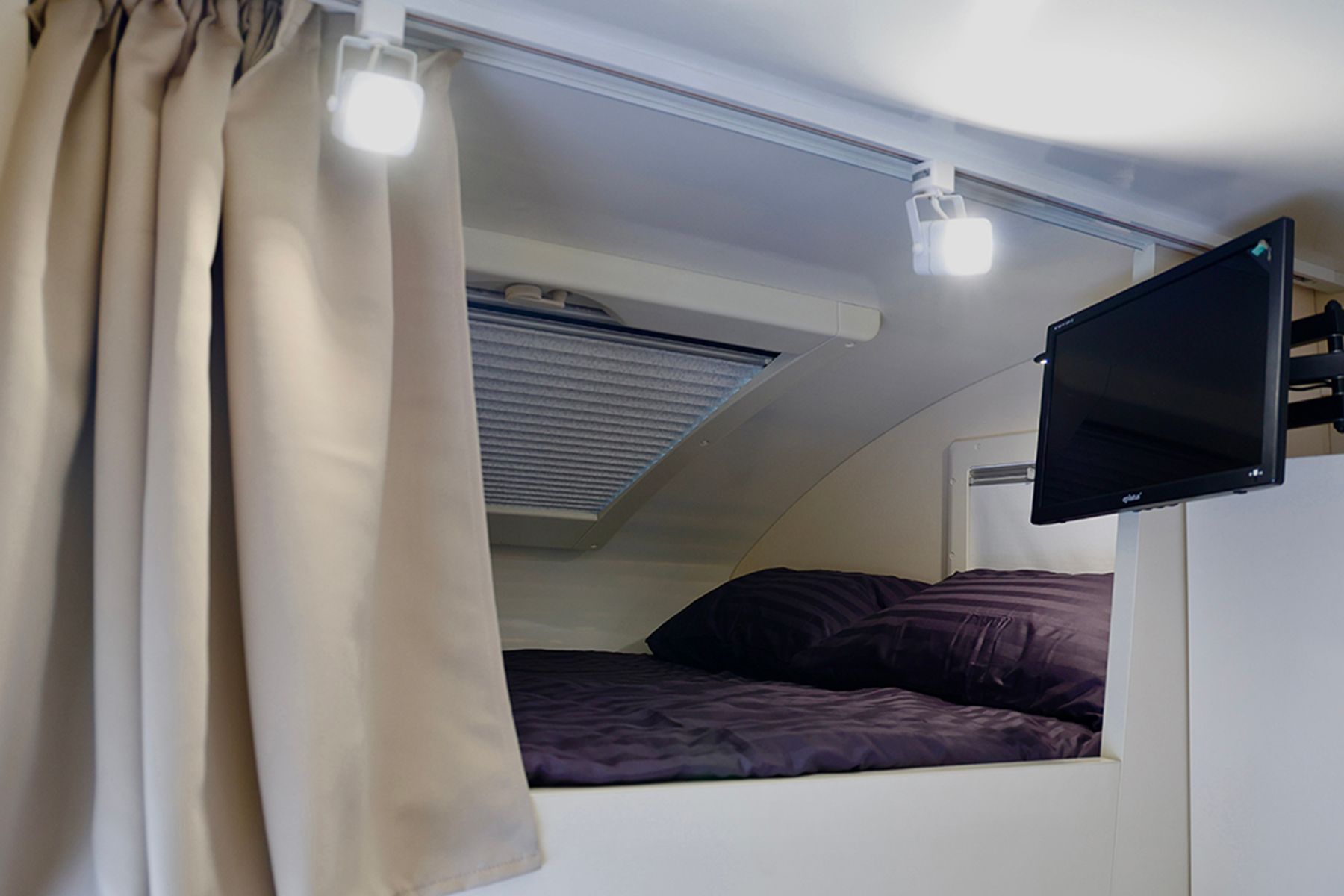 Внутри – продуманное пространство для четырех человек: две спальные зоны, которые при желании можно закрыть шторами.