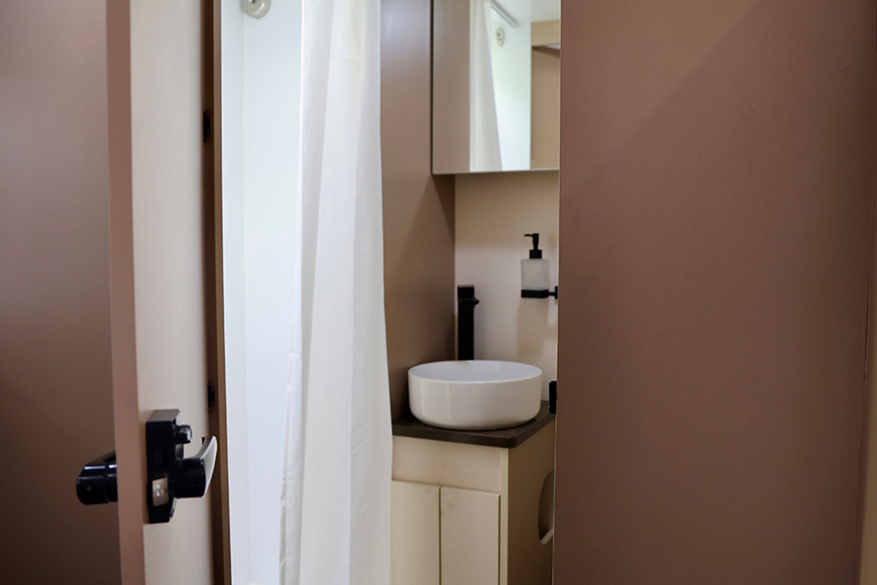 Дополняют чудо-дом базовые вещи: душ, туалет, раковина.