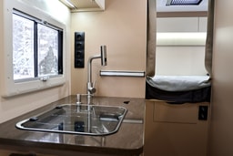 Кухонный блок включает все необходимое для путешествий: газовую варочную панель, 27-литровый газовый баллон, вытяжку, мойку со смесителем, встроенный шкаф, мини-холодильник. Есть и обеденная зона.