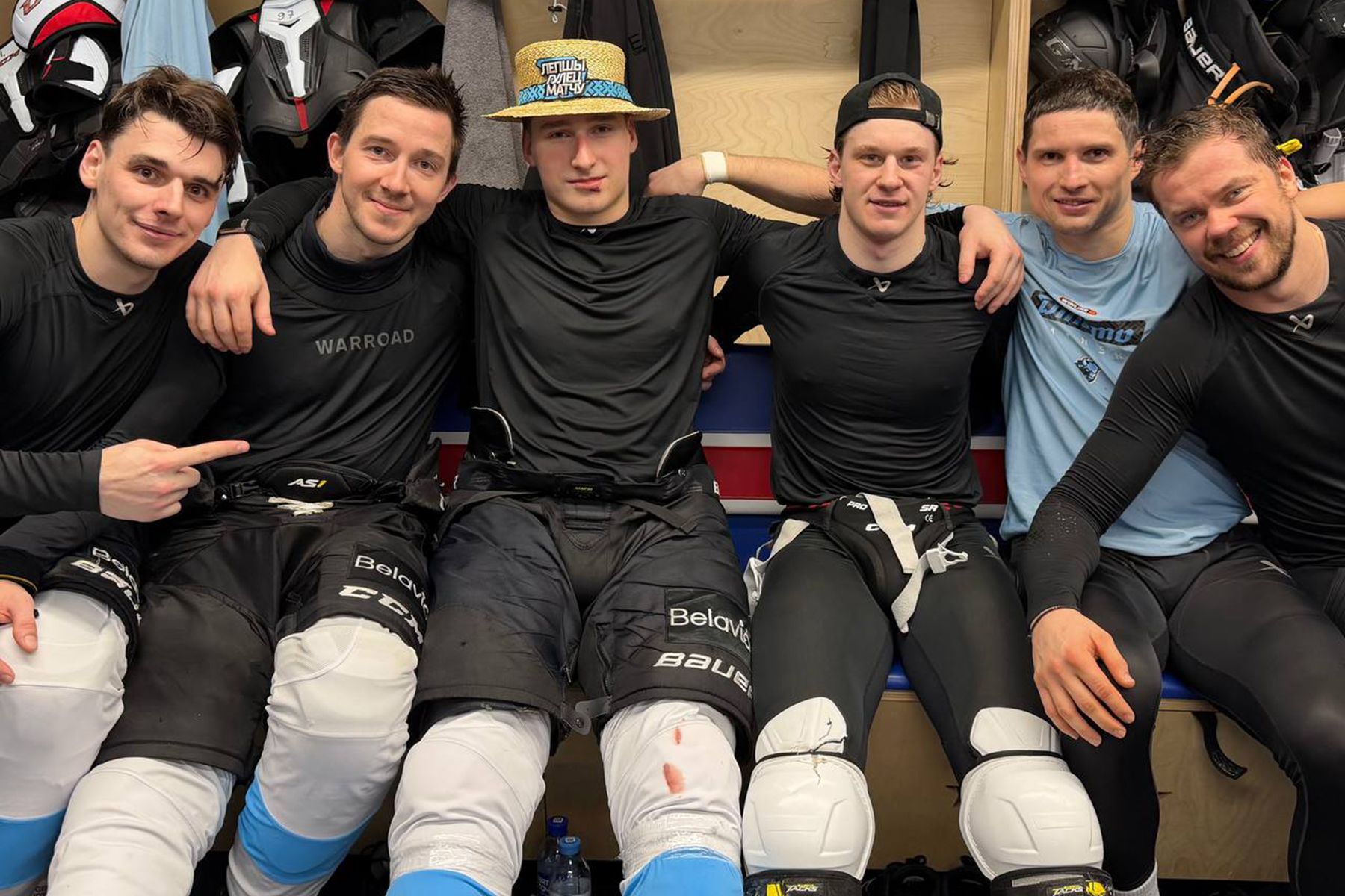 Команда в раздевалке после игры. Шляпа лучшего игрока матча досталась Даниилу Сотишвили. © ХК «Динамо-Минск», Telegram