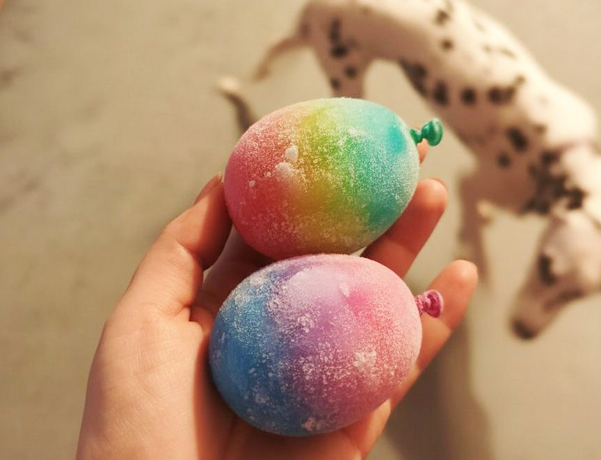 Наполните шарик водой, добавьте соль и несколько капель краски, тщательно перемешайте, завяжите и вынесите на мороз. Важно не переполнять шарик: оставьте немного пространства, ведь при замерзании вода расширяется.