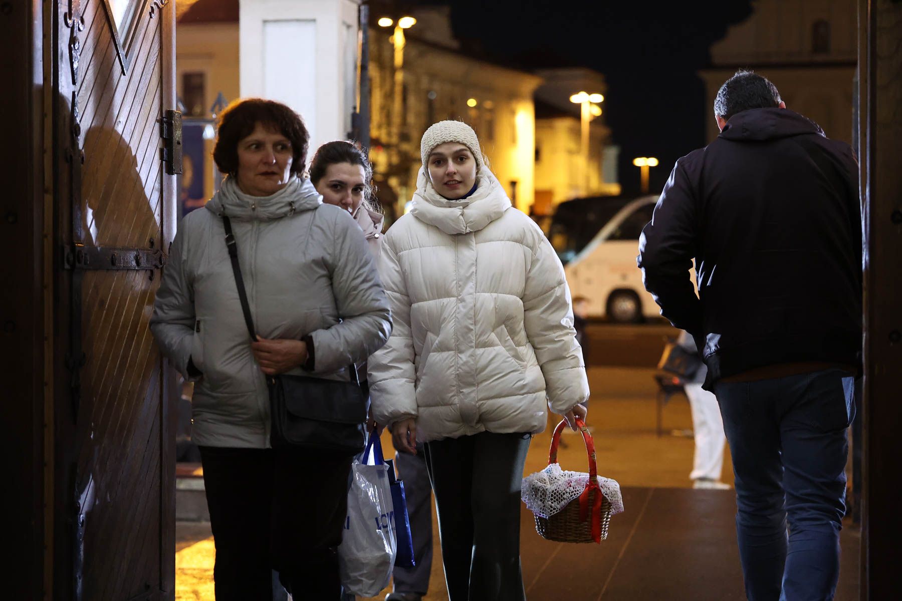 Перед храмом разводится костер, священник благословляет огонь, от которого зажигают пасхал – большую свечу, символизирующую Христа, после чего свет распространяется среди верующих.