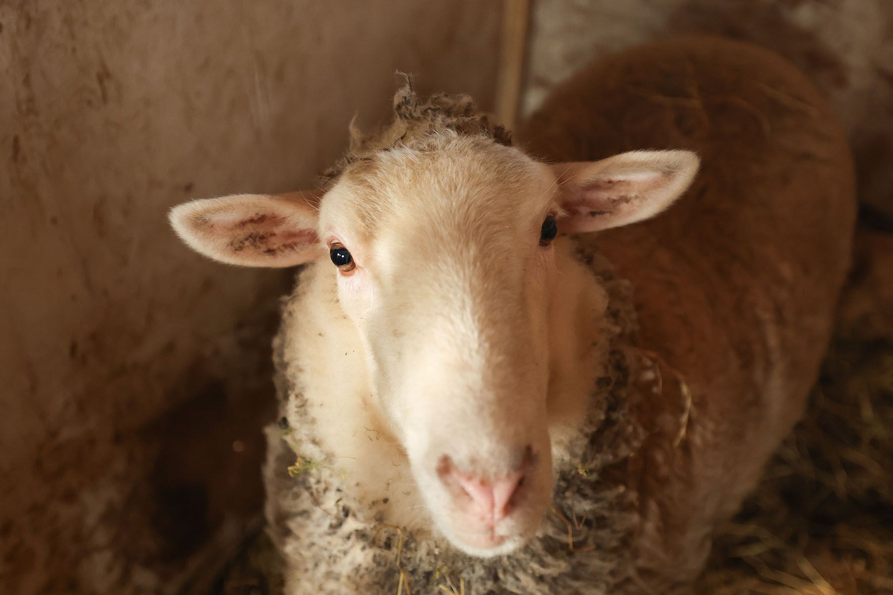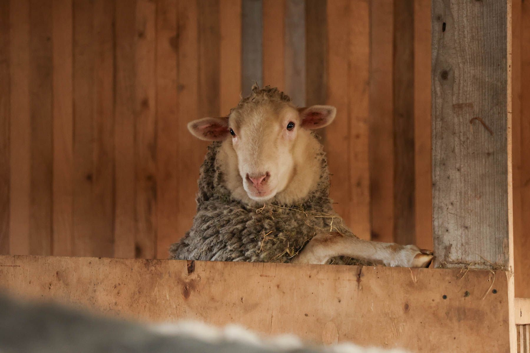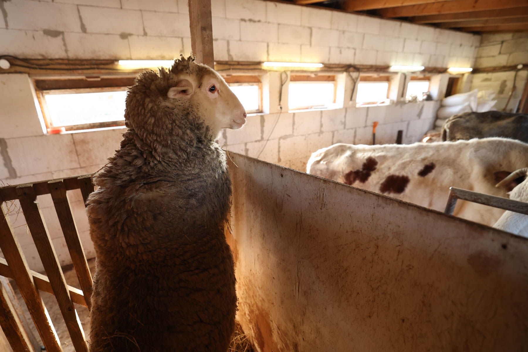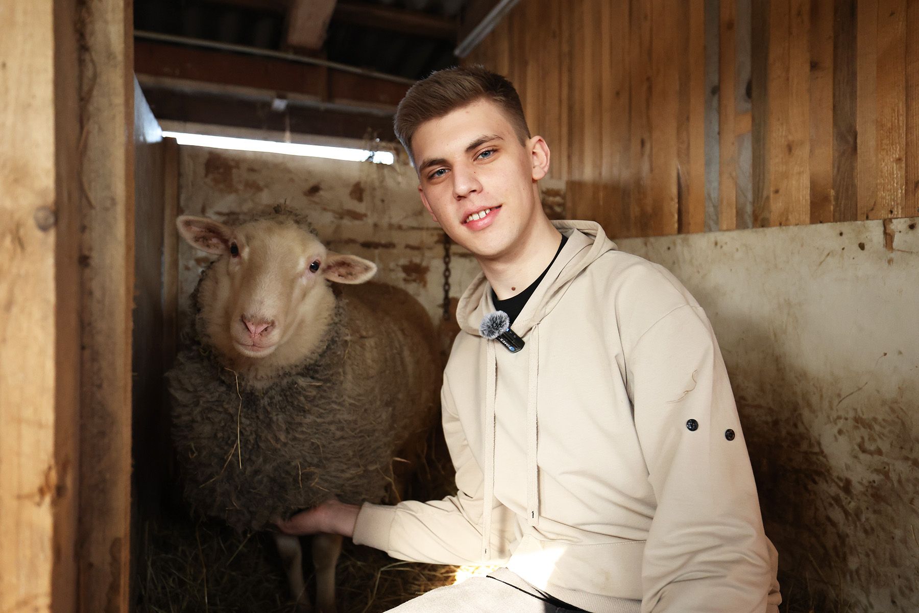Женя показал коровник, который они построили сами. Из-за ограждения в это время за нами следит любопытная овечка Бэлис – любимица семьи и частая героиня блога в TikTok.