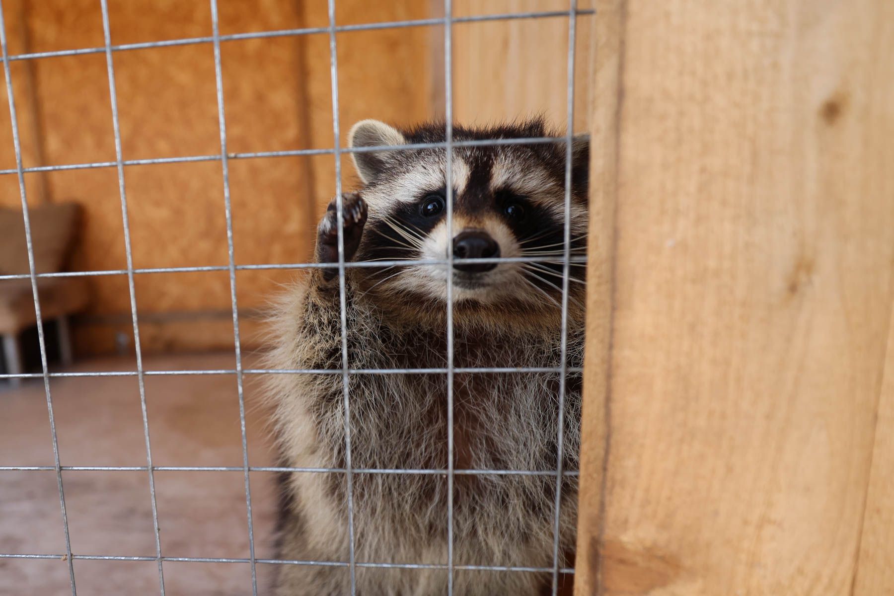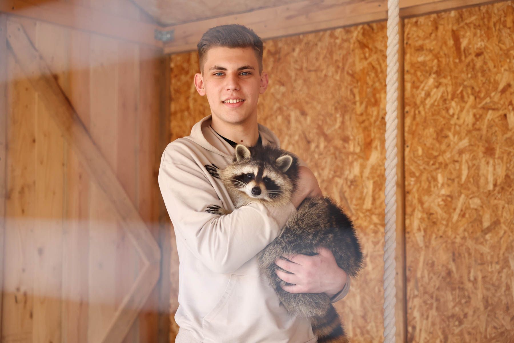 Останавливаемся возле вольера енота по кличке Нота. Правда, сначала зверька видно не было – еноты сами по себе ручные и ласковые, говорит Женя, но им нужно время, чтобы познакомиться и привыкнуть к новым знакомым. Уже спустя несколько минут Нота сидела на коленях у хозяина.