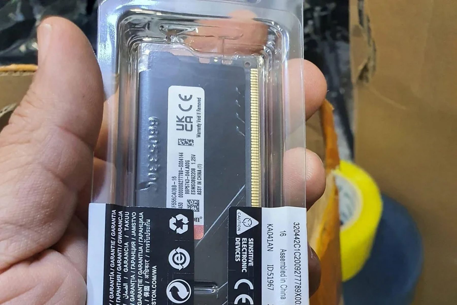 Во время разбора коробки среди бытовых приборов и прочей мелочевки новый владелец наткнулся на клад для геймеров и профессионалов. В паллете находилось 40 модулей оперативной памяти Kingston Fury DDR5, объем каждого из которых составляет 16 Гб.