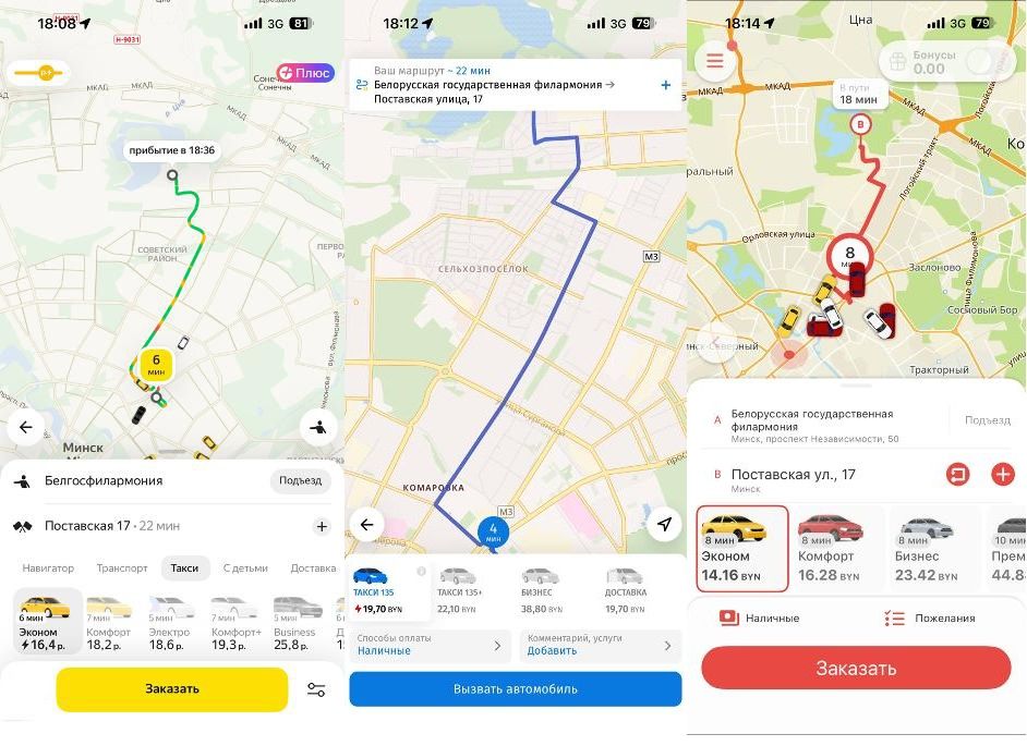 Журналисты Times.by понаблюдали, как меняется стоимость такси в обычные дни и праздничные. Несколько дней подряд мы вбивали один и тот же адрес в разные сервисы такси. Время брали после 18:00, когда большинство людей обычно едут с работы домой.