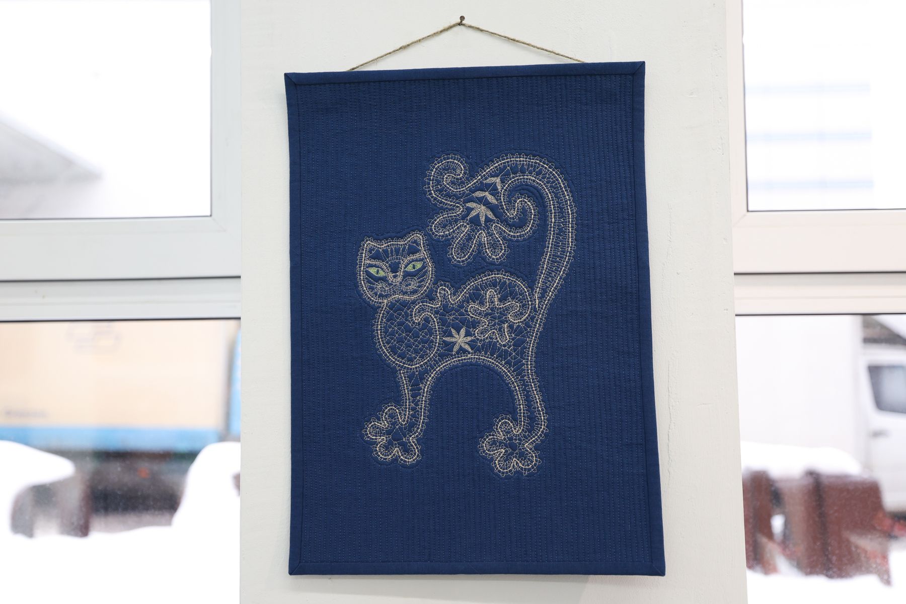 - «Весной расцветают коты» – машинная вышивка 70-летней Лидии Святкиной в стиле вологодского кружева – хвост кота тает в цветах