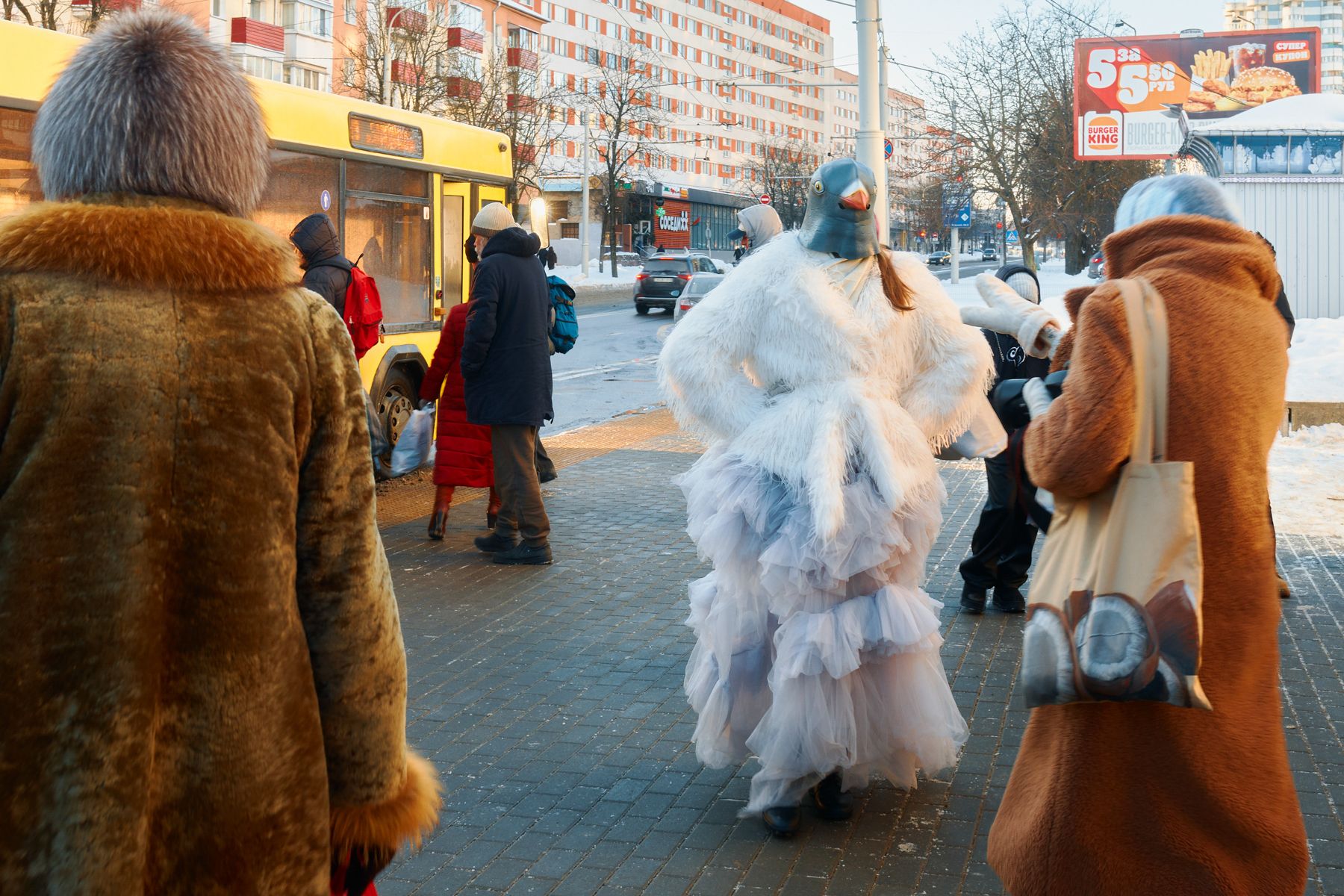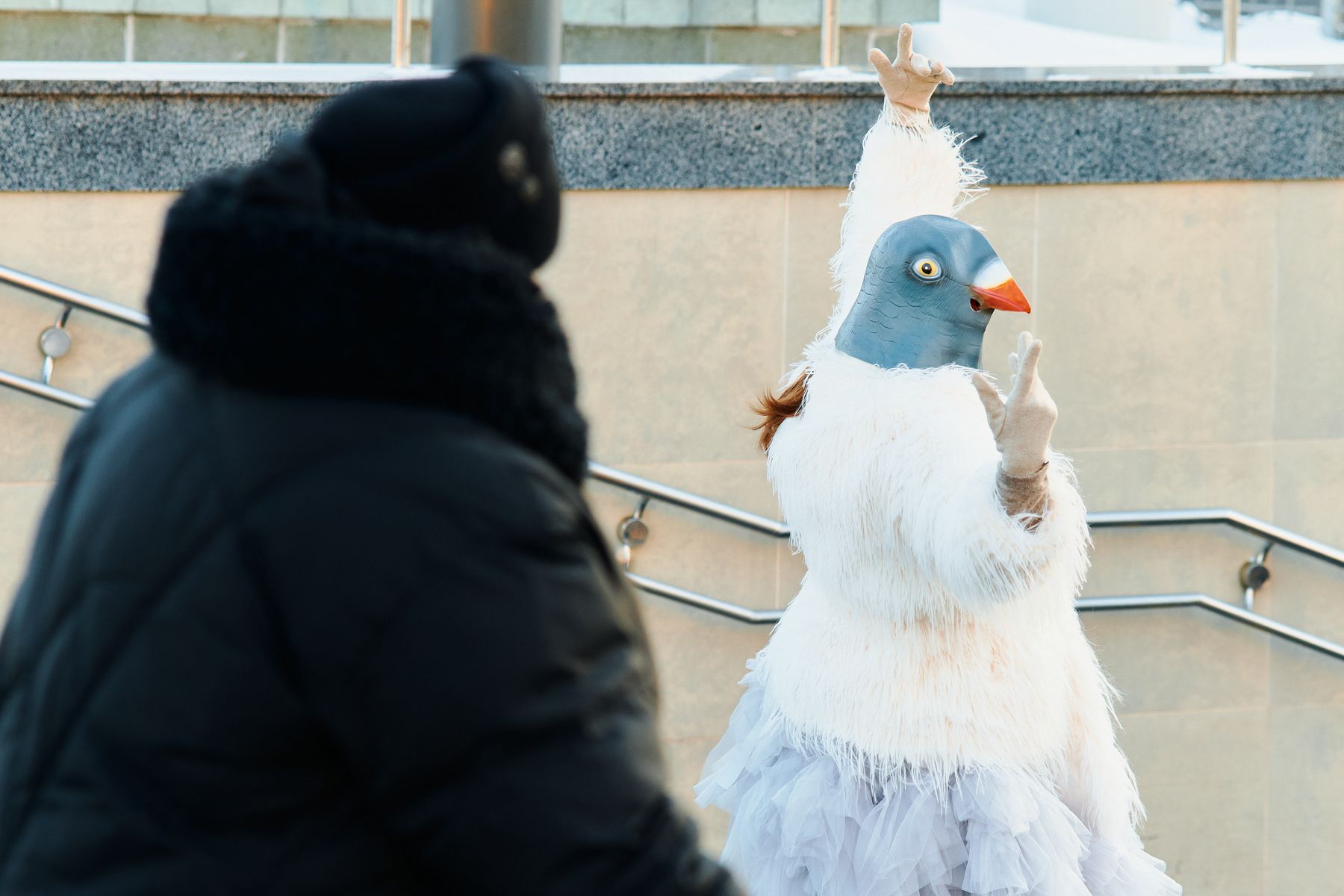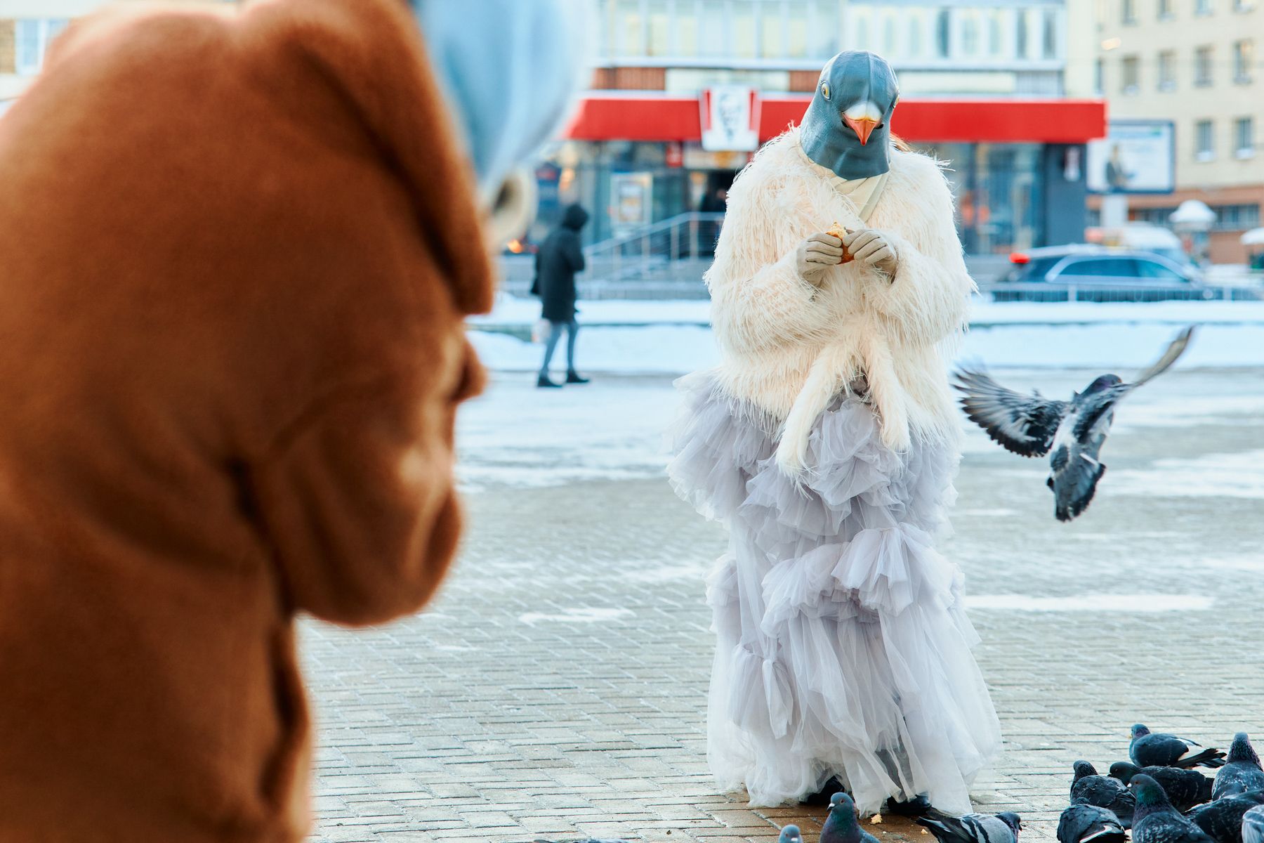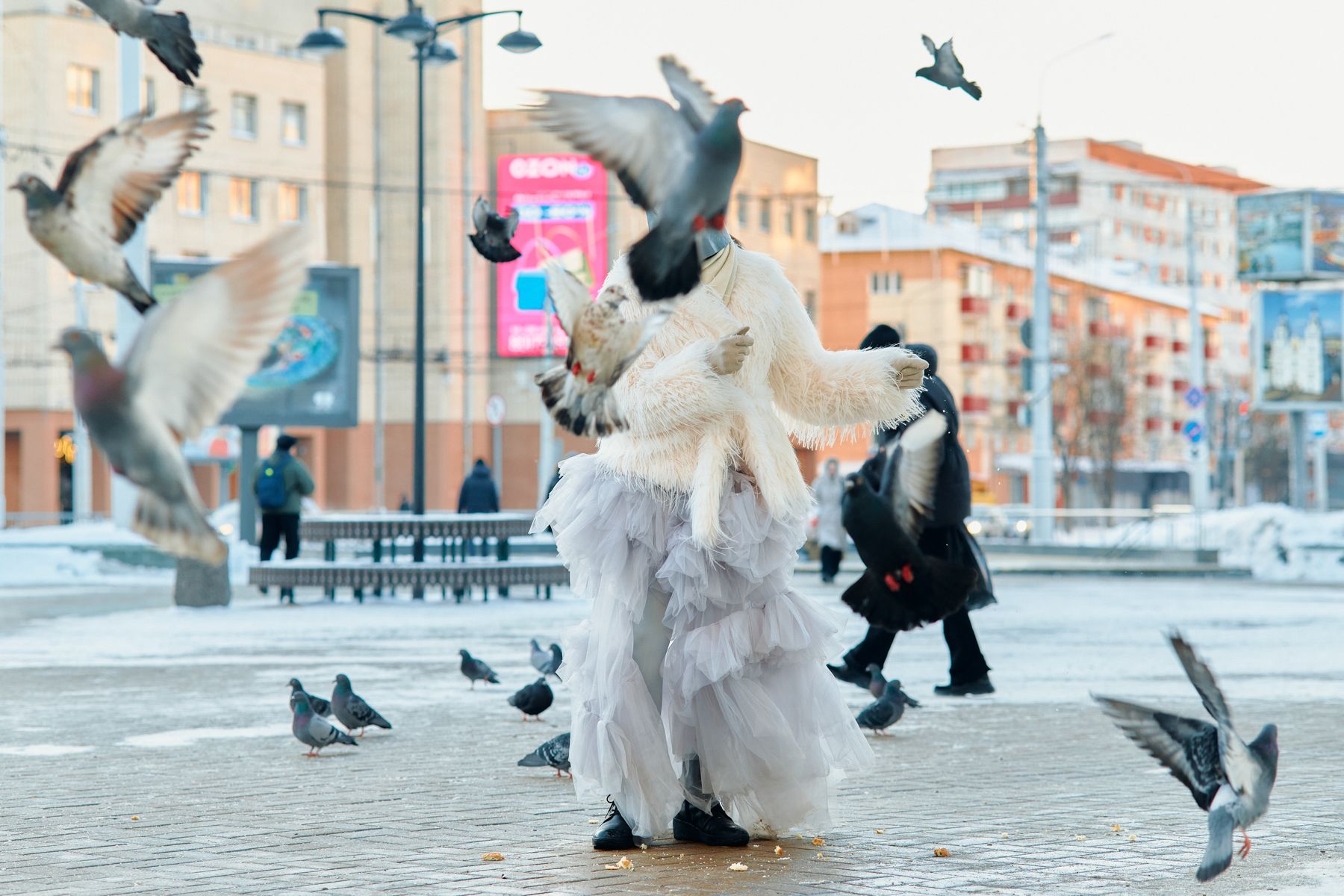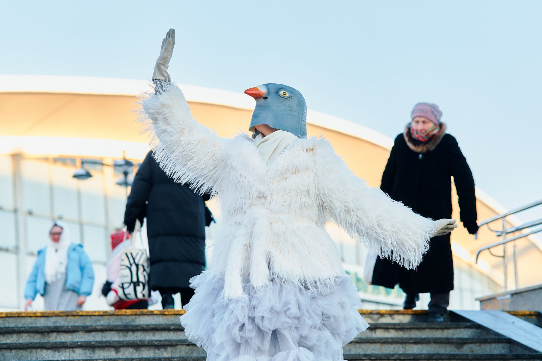Например, сейчас она готовит съемку с девушкой в образе голубя. Фотосет начался в районе Комаровки, где этих птиц как раз много. Так Лина вписывает эпатажный образ в повседневный городской ландшафт.