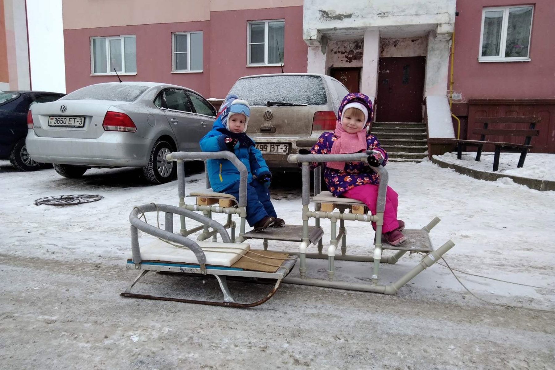 Чуть более 40 метров полипропиленовых труб, столько же муфт и переходников, кусок фанеры и старые лыжи. В Гомельском районе отец двойни проявил смекалку и смастерил санки из подручных материалов.