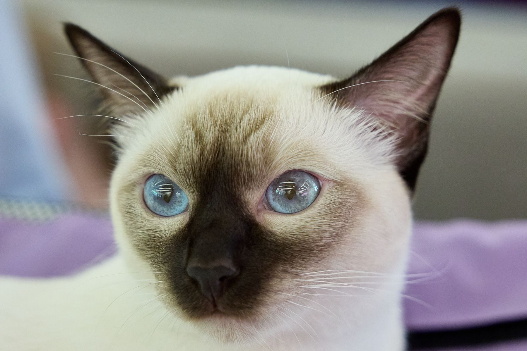 Напротив Вишенки лежит кошка тайской породы, которая с удовольствием работает на камеру. Хозяйка рекомендует ее как разговорчивую, но независимую. По собственному почину взять на ручки не получится. Но если ей надо – своего добьется: либо голосом, либо настырностью.