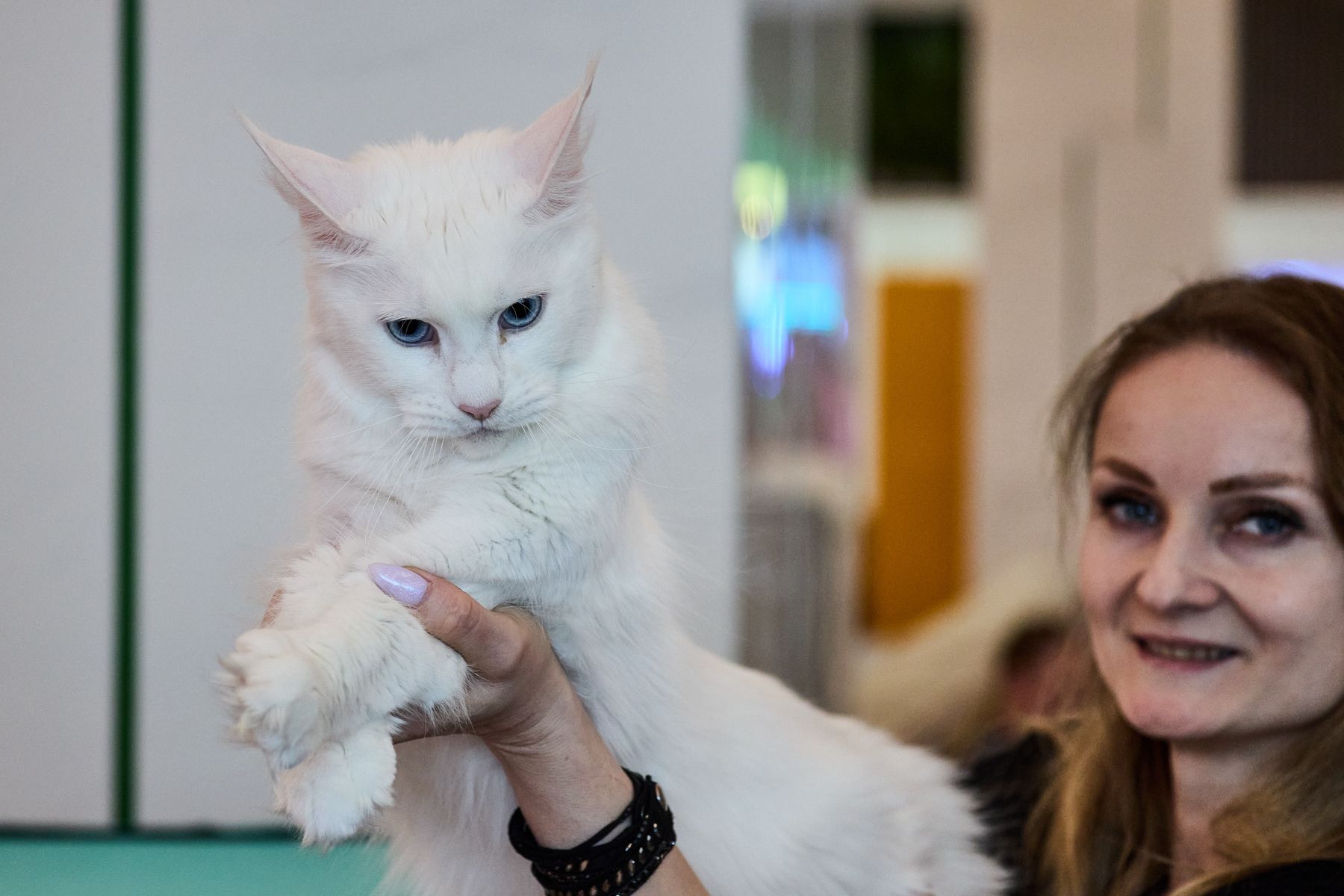 Собеседник привез на выставку троих питомцев. Одну из них отличает белоснежная шубка и небесного цвета глаза. Именно голубой оттенок у этой породы считается редкостью и делает котят более дорогими, если покупаете с целью последующего разведения. А вот полидакты – животные, у которых шесть пальцев на лапах, а не пять – дороже, если покупаются как питомцы. Стоимость начинается от 1500 белорусских рублей.