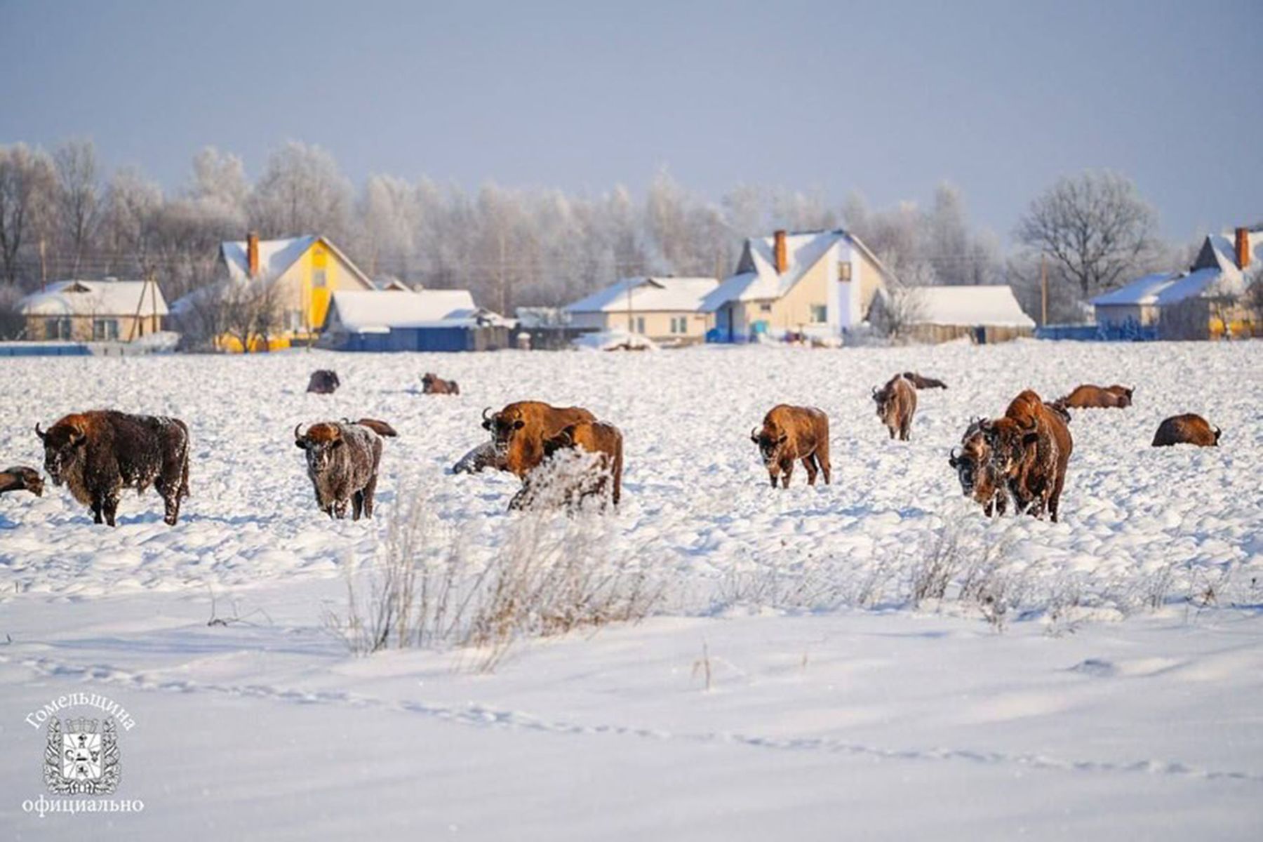 Стадо зубров пришло к жителям агрогородка Озераны. © gomel_region, instagram.com
