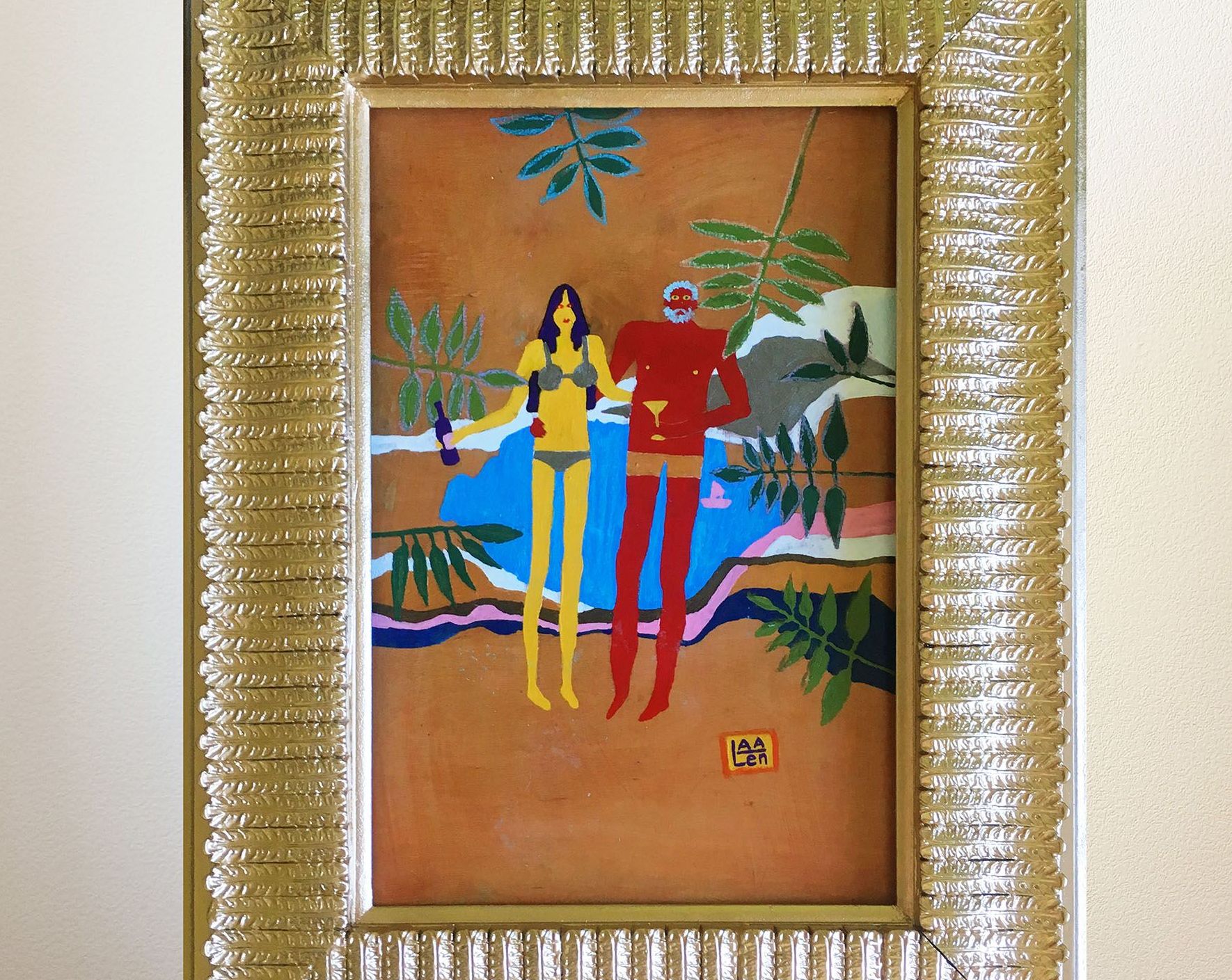 «Как-то в столярной мастерской мне попался кусок фанеры с интересной фактурой. Придуманный сюжет решила реализовать именно на этой доске. Так появилось «Комсомольское озеро» – примитивный, ироничный пейзаж. Я выложила его фото в популярный тогда VK, и мне написал какой-то парень с предложением купить работу. Я согласилась и поставила ценник в Br40-50».
