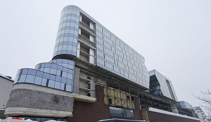Завершается монтаж изогнутых стекол – это радиусные витражи, которые обрамляют углы фасада. По словам главного архитектора проекта Ивана Виноградова, в Беларуси они используются впервые в таком объеме, пишет агентство «Минск-Новости».