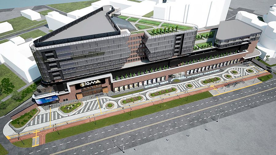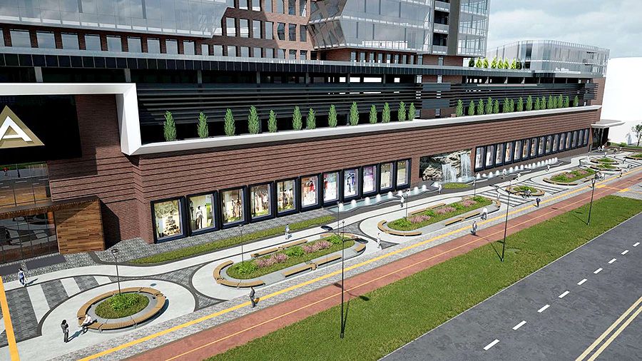 Застройщик приобрел участок несколько лет назад. В здании запроектирован двухуровневый магазин с эскалатором, предусмотрены трехуровневая парковка, большой фудмолл и гипермаркет, объекты торговли, офисы.