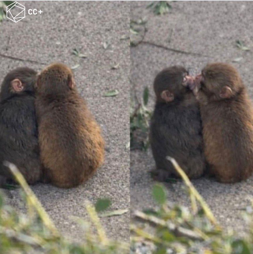 Маленький ловелас заботливо оберегает другую макаку. Они вместе играют, обнимаются, катаются на качелях, а по соцсетям расходится снимок обезьянок, где они целуются.
