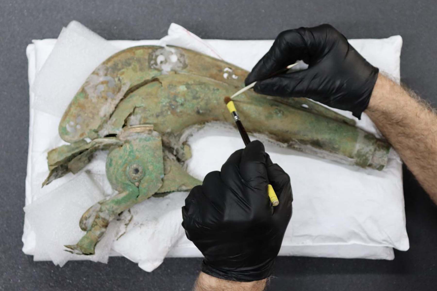 В ходе работ были также найдены бронзовый боевой штандарт в виде головы кабана и пять умбонов.