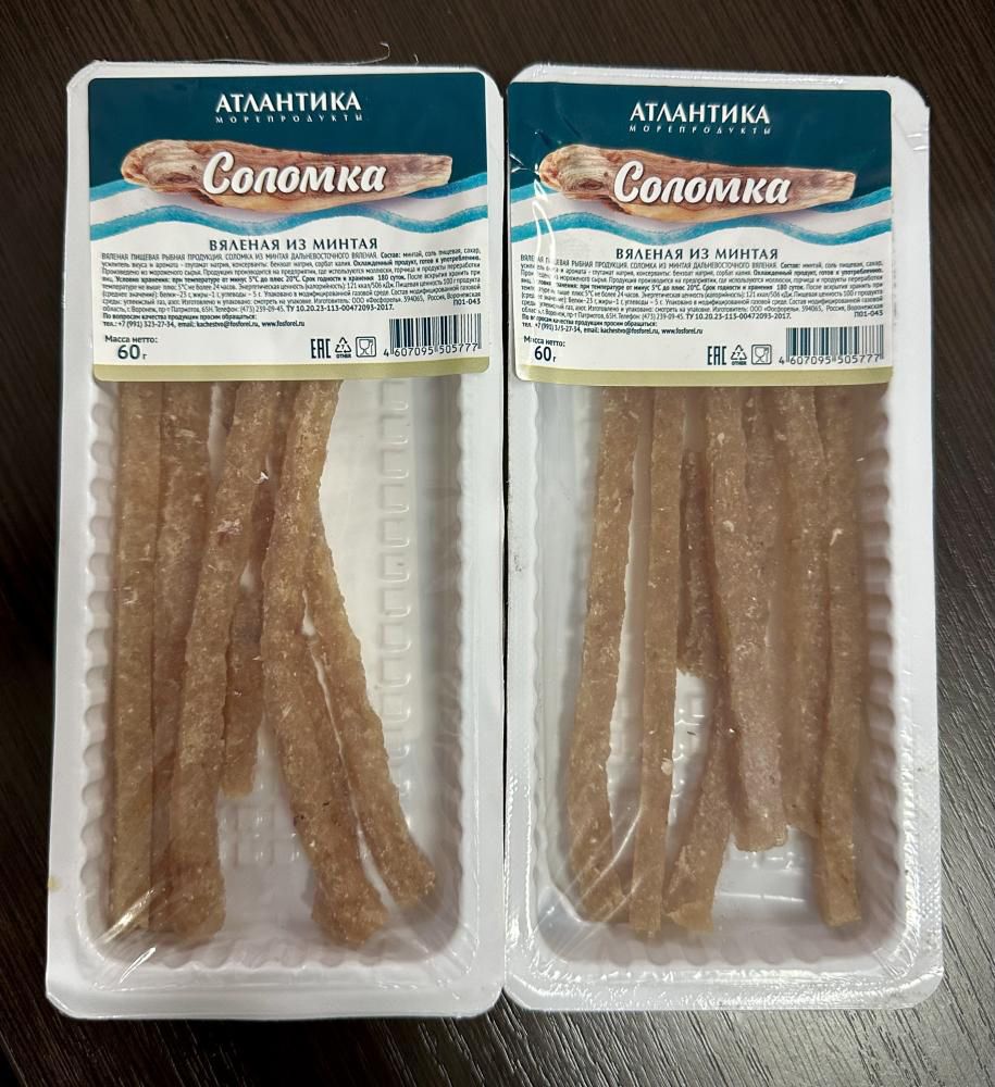 Неприемлемые добавки также нашли в соломке из минтая вяленой бренда «Атлантика». Здесь целый набор недопустимых пищевых добавок: консервант сорбиновая кислота (Е200), консервант бензойная кислота (Е210), сорбат калия (Е202), бензоат натрия (Е211).