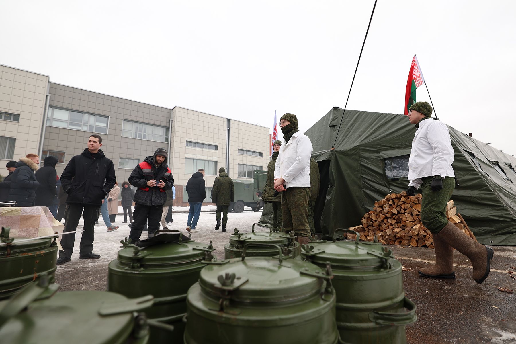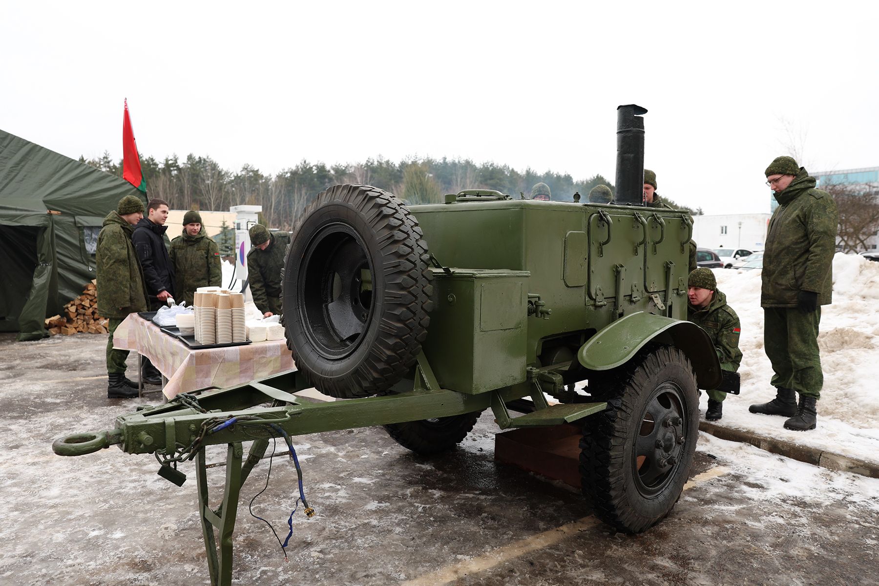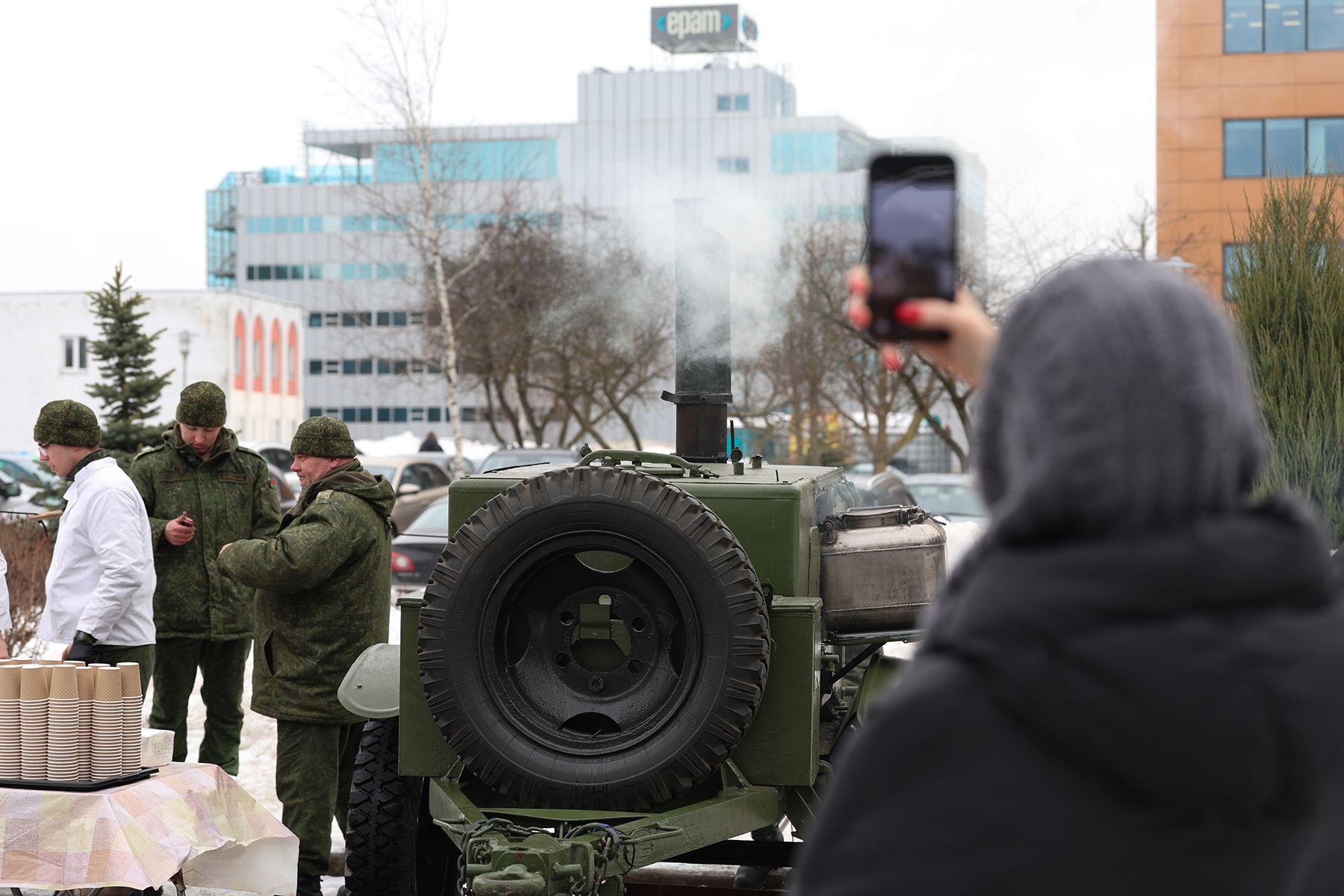 23 февраля в Парке высоких технологий (ПВТ) к обеденному перерыву военные развернули полевую кухню и небольшую столовую, а также привезли специальную агитационную машину.