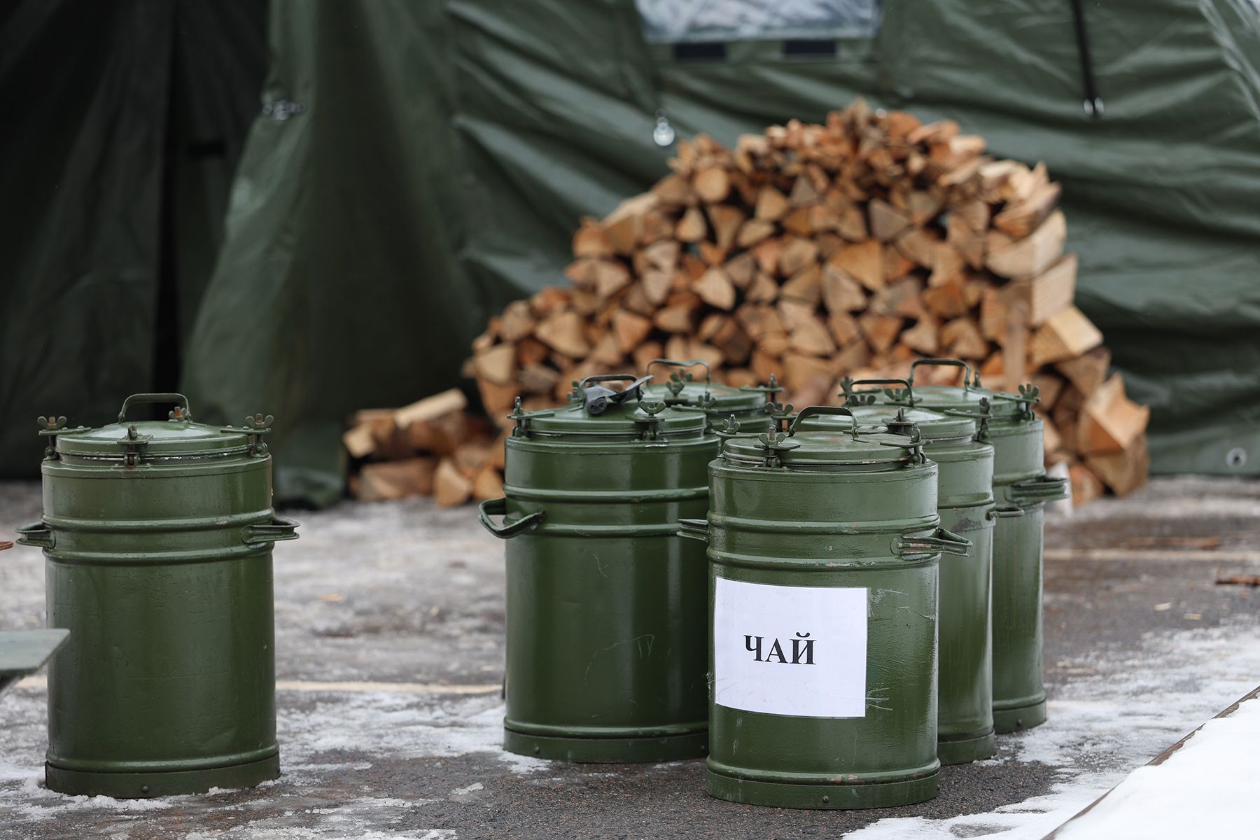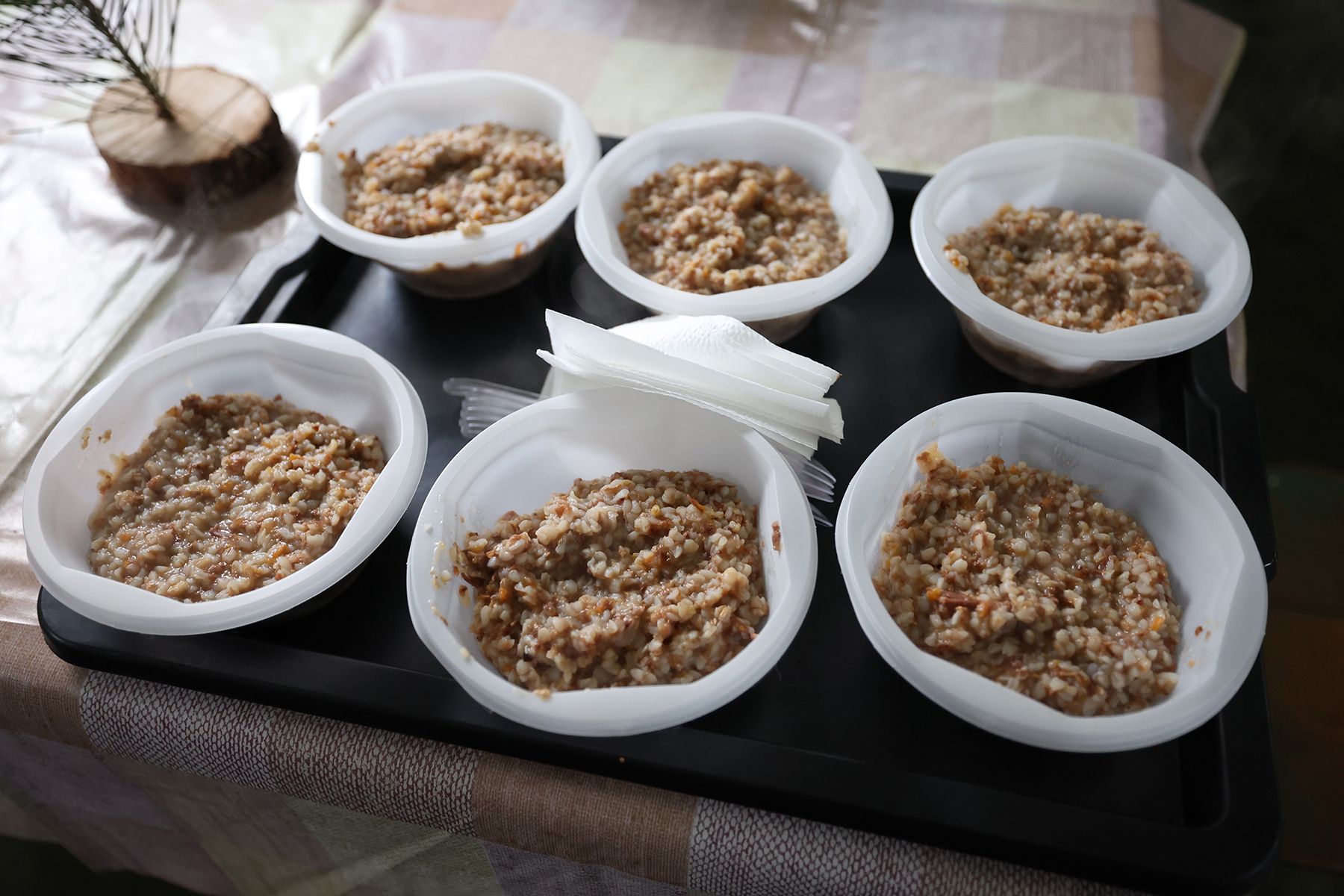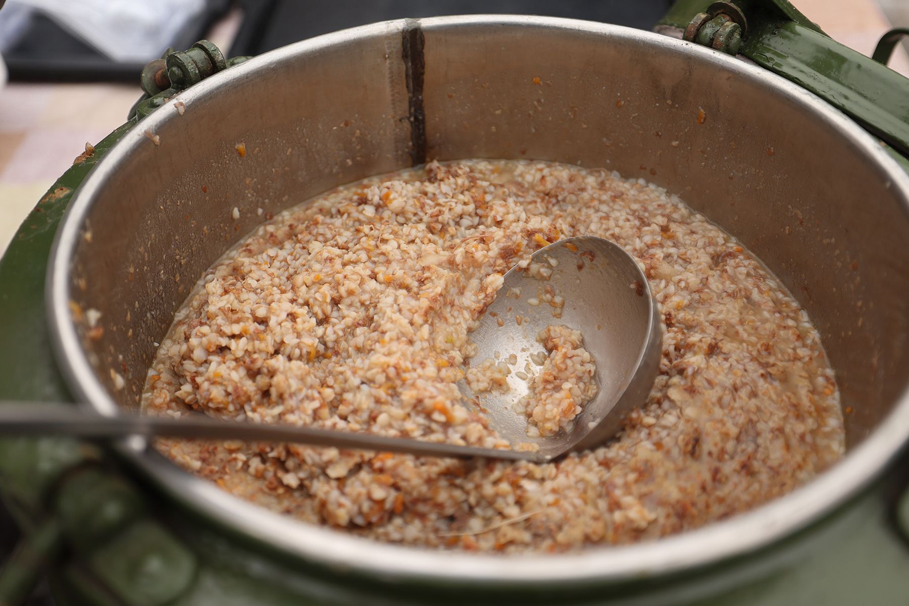 К этому моменту солдатская каша была готова. Военные приготовили угощение на 350 человек – 80 кг гречки с тушенкой. А на десерт предложили крепкий черный чай с сахаром.