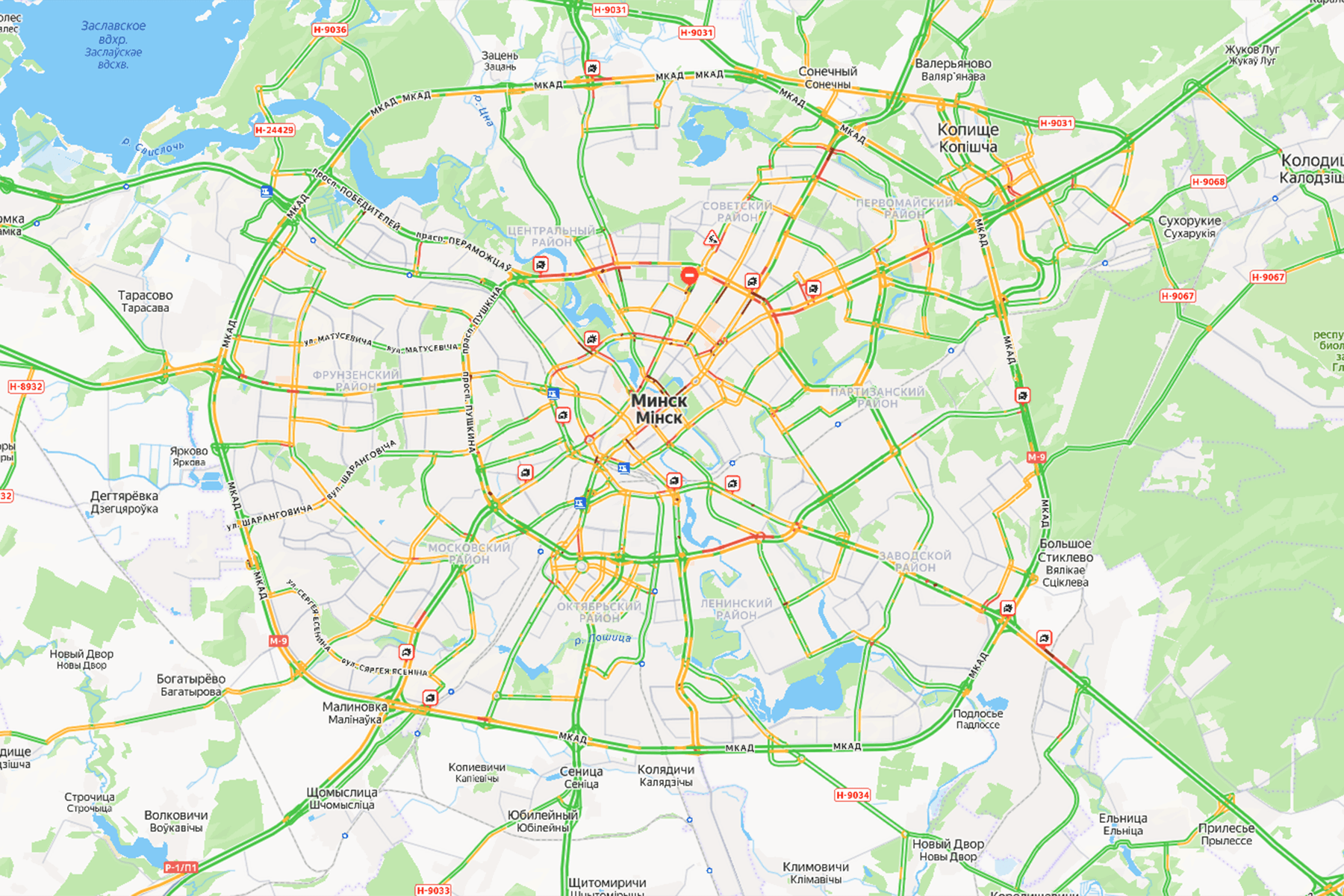 Согласно сервисам онлайн-мониторинга, в городе по состоянию на 19:00 были зафиксированы девятибалльные пробки. От центра до первого транспортного кольца все основные дороги были подсвечены желтым, красным и даже бордовым цветами. Самые большие пробки наблюдались на улицах Сурганова, Первомайская, Ульяновская, Якуба Коласа, Орловская и проспектах – Независимости, Победителей, Дзержинского и Машерова.