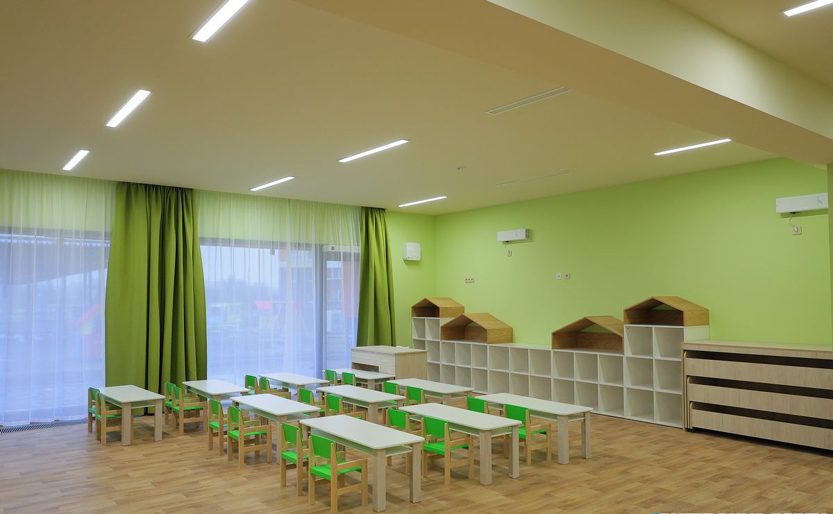 Детскому саду присвоили номер 115 и назвали его «Городок». Еще на стадии проектировании все продумали до мелочей. В раздевалках – шкафчики для одежды и обуви с подогревом. Вместо скамеек – круглые пуфики с мягкими сидениями. В группах – шкафчики в виде домиков с крышей, в вестибюле – сборные домики, представляющие собой кафе, магазин, салон красоты.