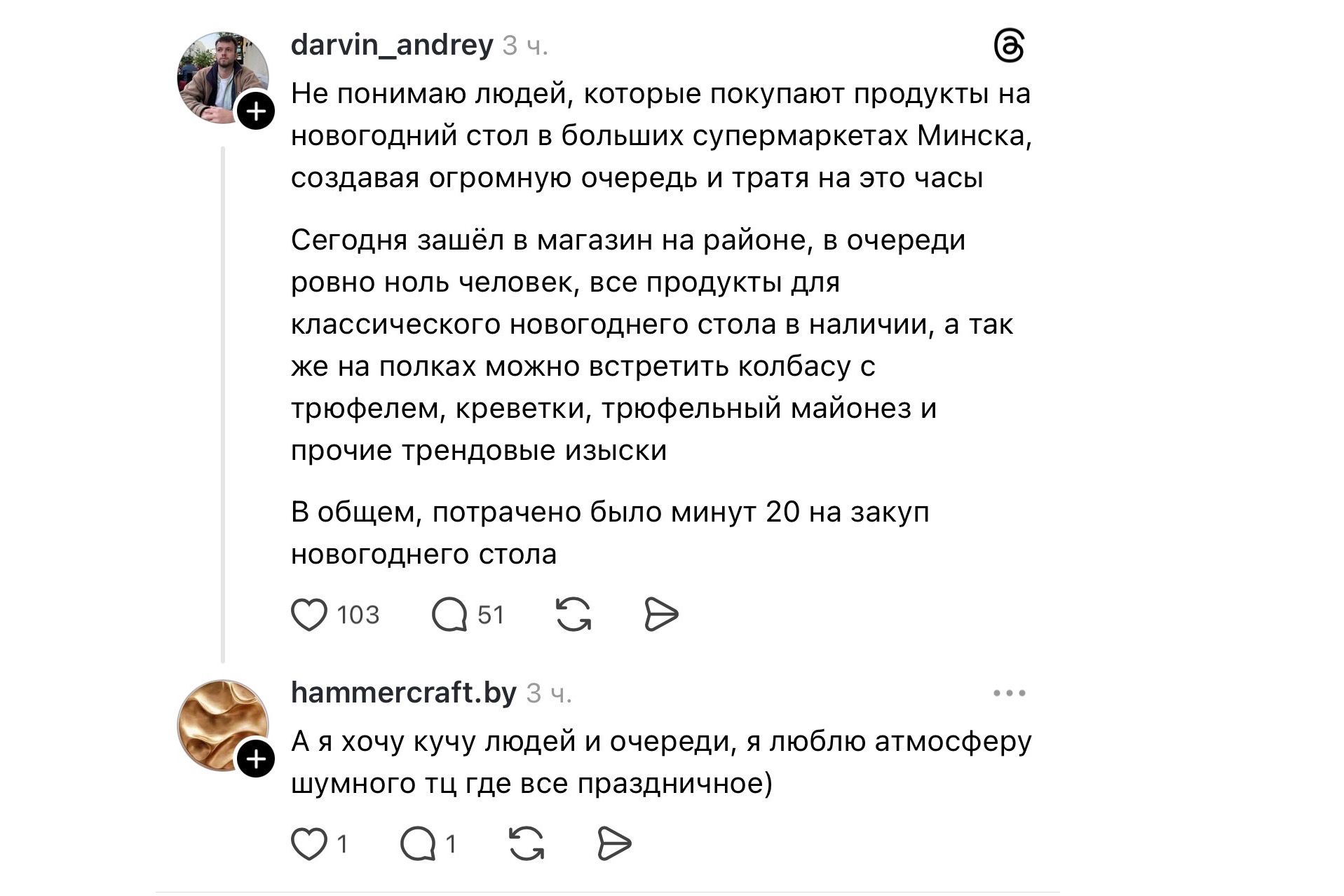 В соцсетях это стало темой номер один. Люди активно обсуждают, в каких магазинах большие очереди – а где все спокойно. Например, самые находчивые отмечают, что в магазинах у дома нет очередей и можно купить базовый набор для праздничного стола.