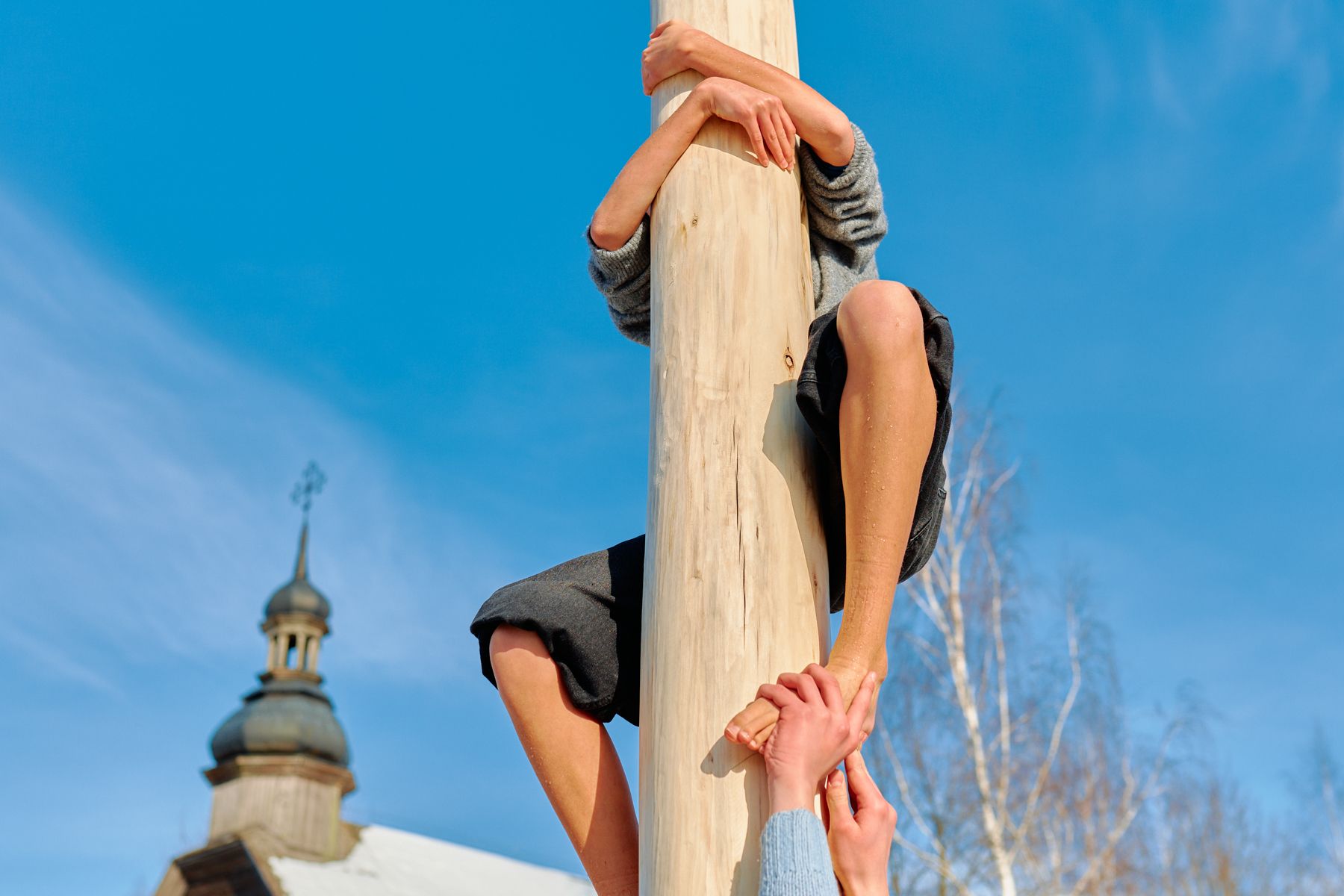 Каждый снимал с вершины мешочек, где написано, что он получает: можно было выиграть мешок картофеля, моркови, свеклы, а также подарки от партнеров и музея. Гости праздника, в том числе и девушки, отчаянно пытались покорить столб, но дерево скользило под стопами.